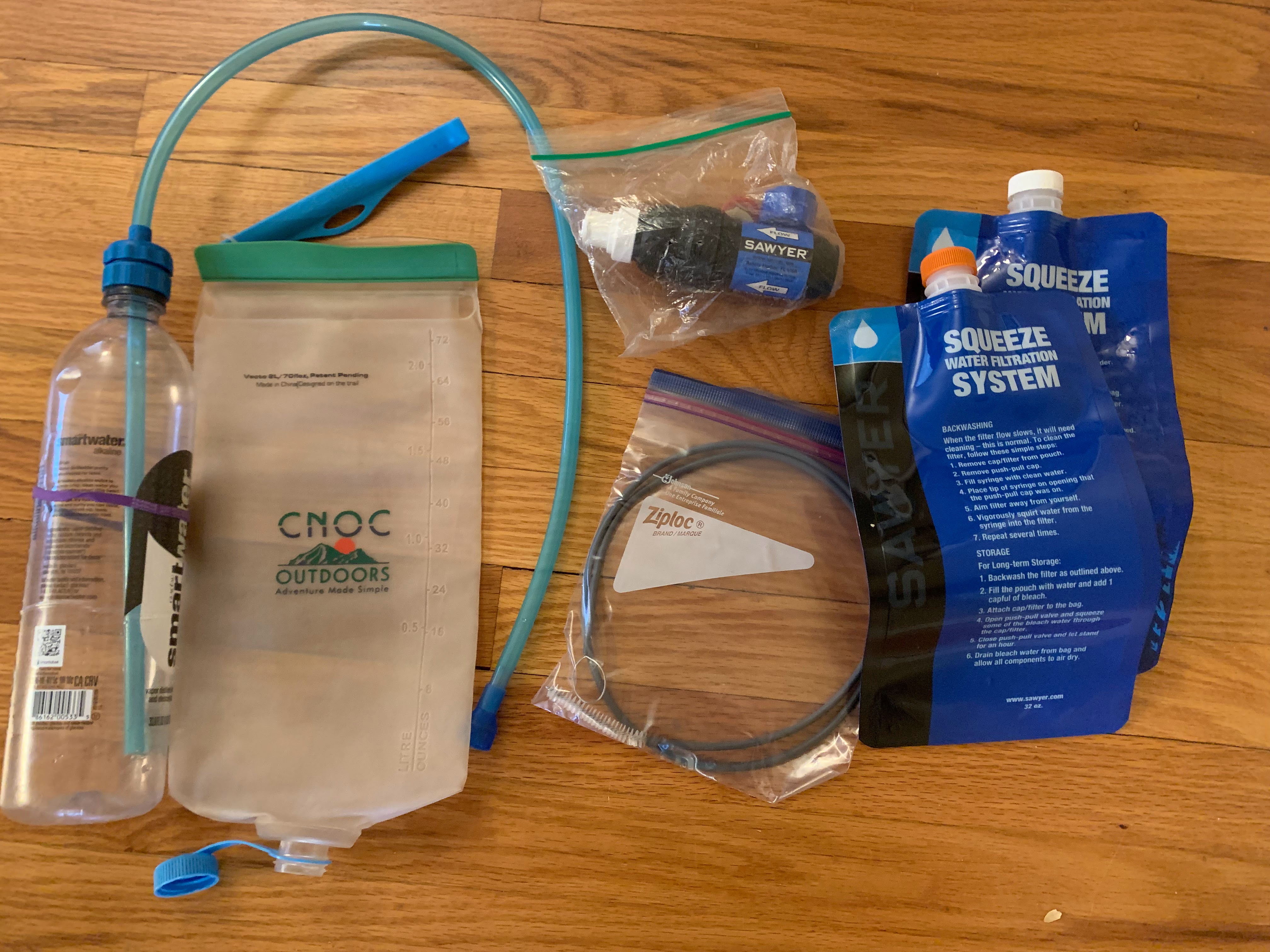 We both have the same system for carrying and filtering water. Two Smart water bottles with a SmarTube hydration tube, a Sawyer Squeeze water filter, and the Cnoc Outdoors Vecto 2L water bag. For extra water carrying capabilities we will each be carrying two Sawyer Squeeze 1L water bags. Ellen will also carry the water tube cleaning brush.