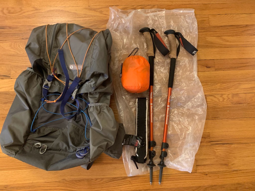 We both have the Gossamer Gear Mariposa 60L backpack, the Lightheart Gear orange pack cover with hood, and a plastic bag liner. We also each have a pair of trekking poles and a sun umbrella.