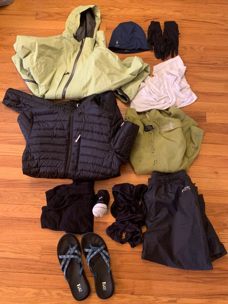 The pictures below are the clothing that Ellen will be wearing and carrying. Starting at the top, a Mission sun hat, sunglasses, a Buff, a sun hoodie, black running shorts, Exofficio underwear, Brooks sports bra, Wrightsocks ankle length socks, Dirty Girl gaiters, and Altra Lone Peak 7 trailrunners. Rain/cold gear consists of a Golite rain jacket, Columbia rain pants, Alaskan fleece shirt, SmartWool Merino beanie, REI liner gloves, Showa waterproof insulated gloves, and a Big Agnes hooded puffy. Other clothing items include an extra pair of socks and underwear, a sleeping shirt, flip flops, and leggings.