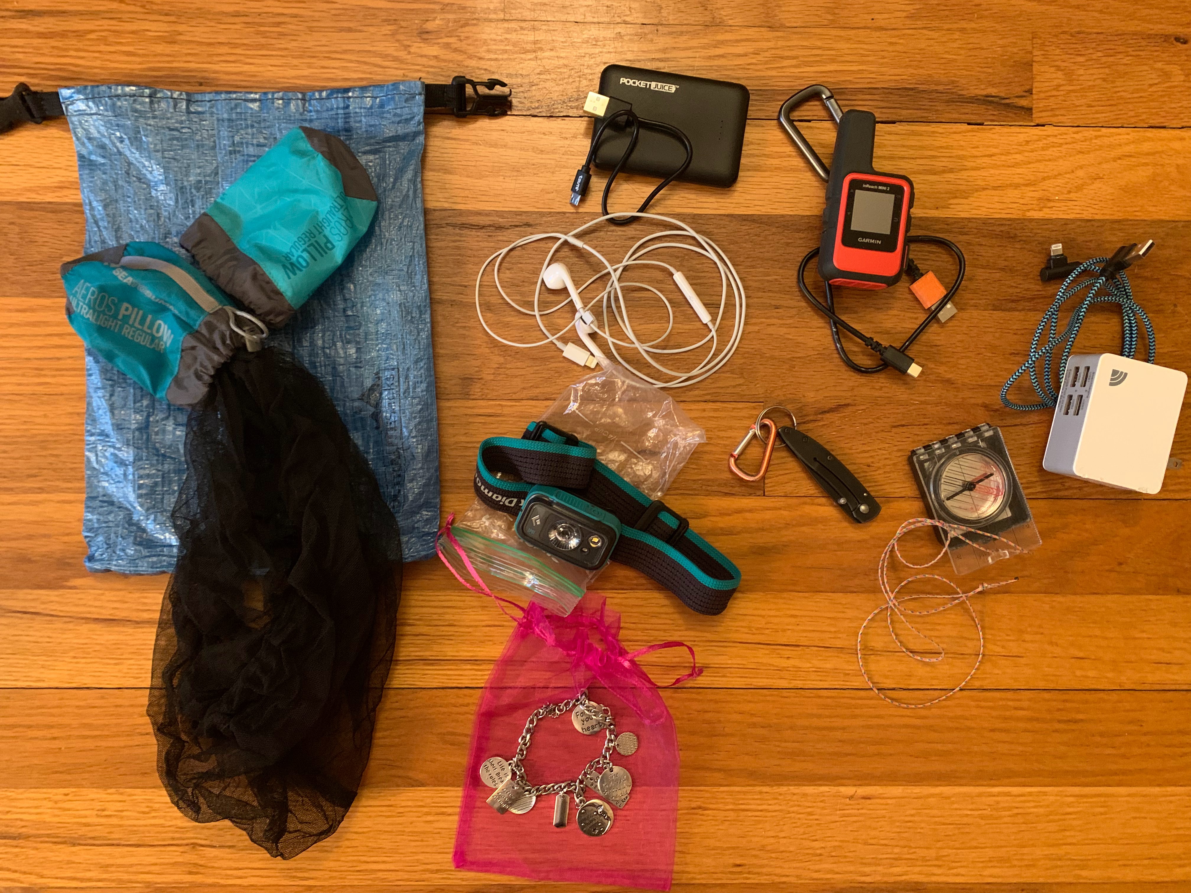 Ellen’s first aid / repair gear includes a small hairbrush with hair ties, strips of Leukotape, a roll of precut K-tape, variety of medicines (Ibuprofen, anti-diarrhea, antihistamine, and Mucinex), variety of Band-Aids, Neosporin, nail clippers, tweezers, toothbrush, toothpaste tables, powered soap, Tiger balm, needle w/thread, air mattress patch kit, and extra AAA batteries. Extra bonus gear, Ellen will also carry a bracelet with motivational charms that she got from her friends.