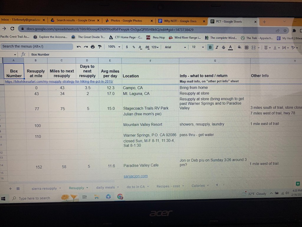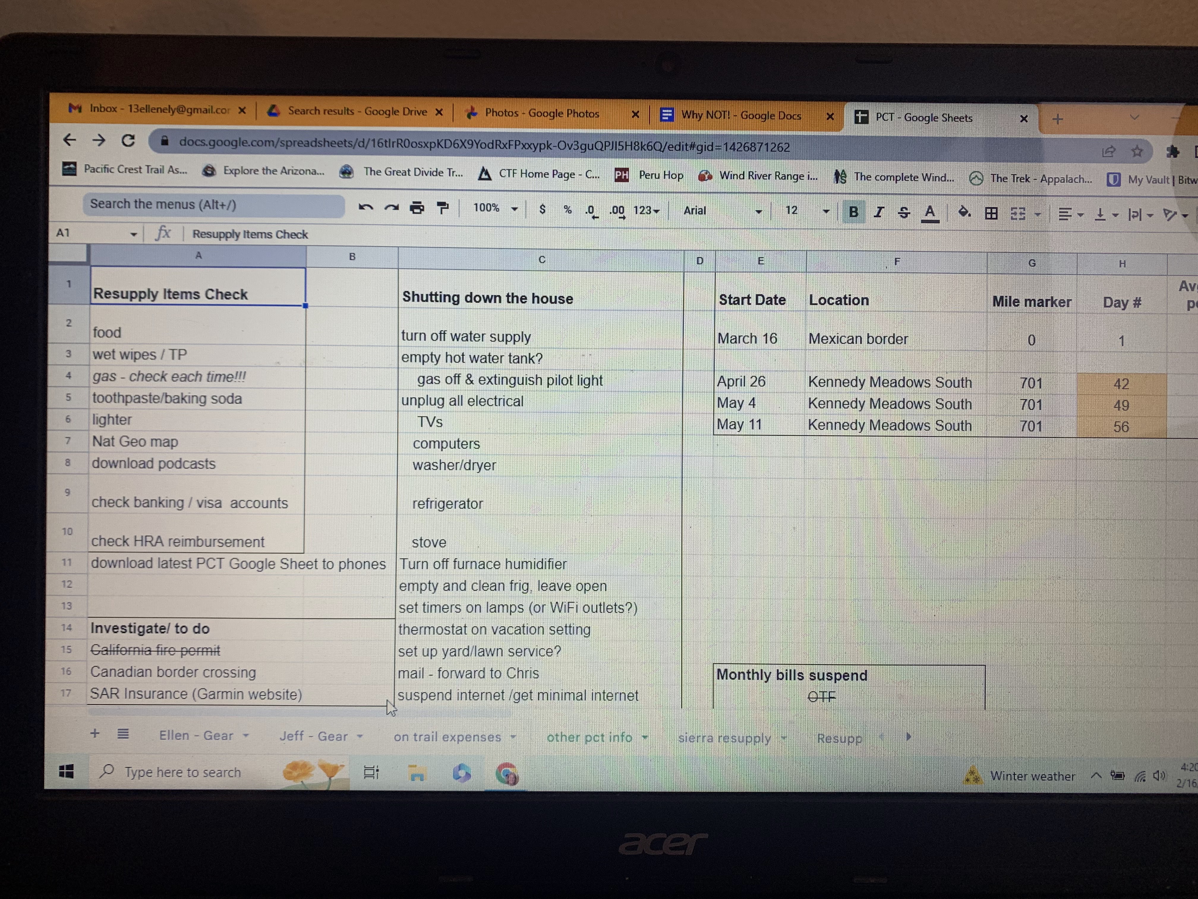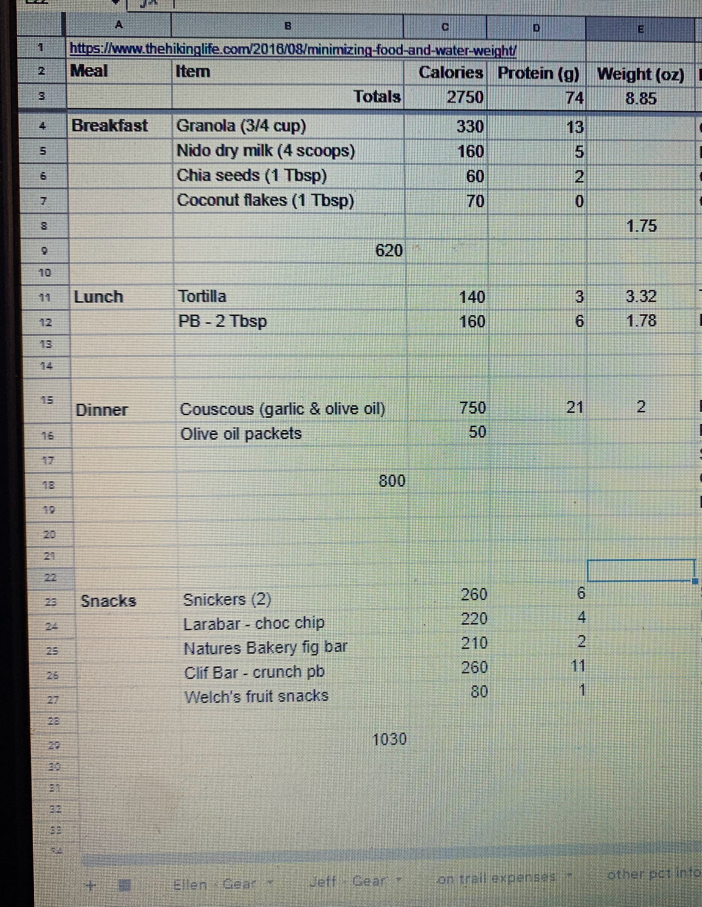 Anyone that knows us, knows that we are both spreadsheet nerds. We have spreadsheets for backpacking gear, canoe tripping gear, mileage for canoe trips, budget, etc. We like to stay organized. So of course, Ellen created a PCT specific spreadsheet. This spreadsheet has about 10 tabs: Ellen gear, Jeff gear, other PCT info, resupply, sierra resupply, on-trail expenses, daily meals, to-do in CA, recipes-cost, and calories. We’ll talk about gear under the gear section.