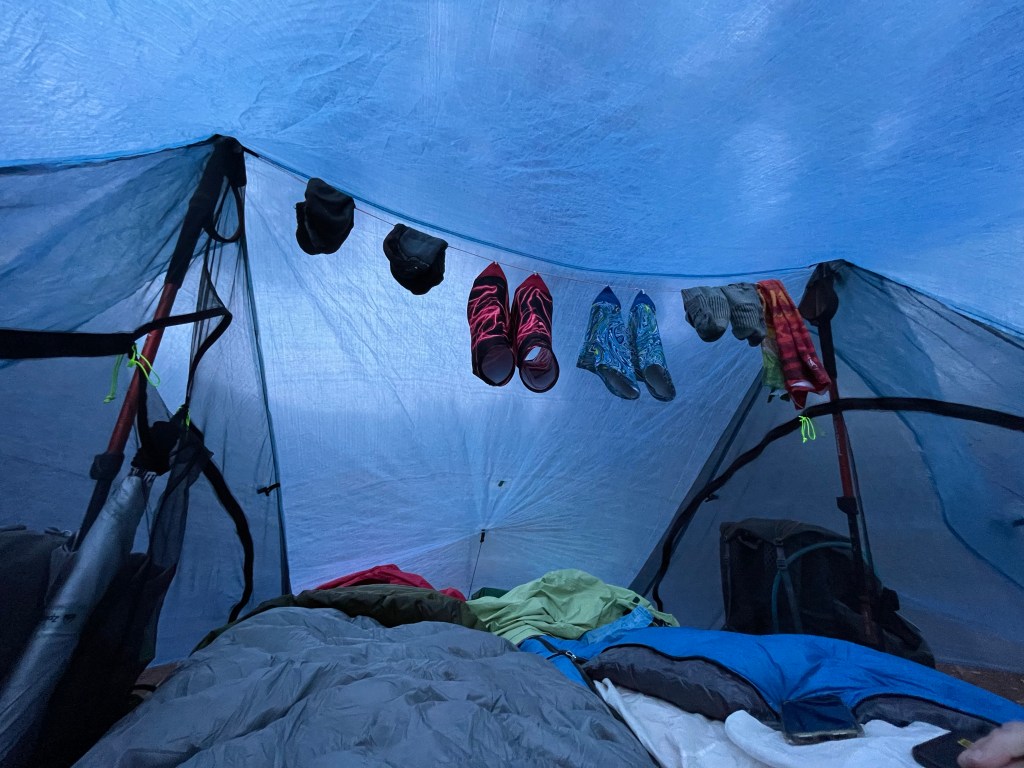 During the evening we noticed an incredible amount of condensation both on and inside the tent. The ground was super saturated and the humidity was extremely high. Then, as morning drew near the temperature dropped just below freezing and it turned to ice. A snow ball formed inside the tent as were shaking off the ice.