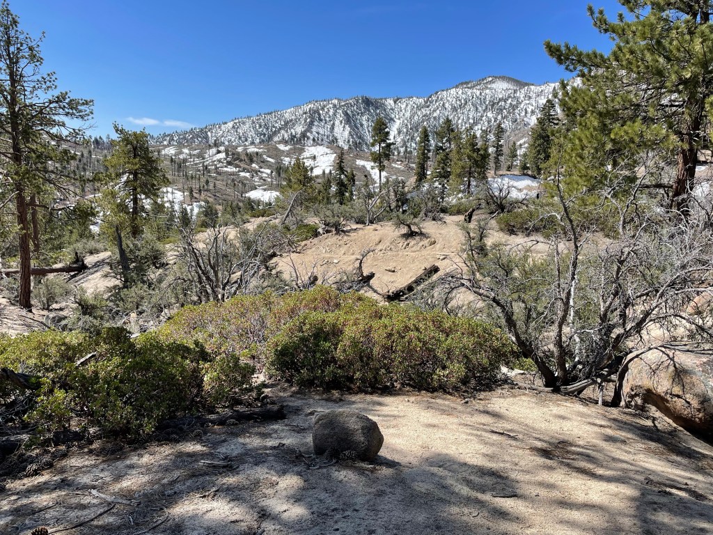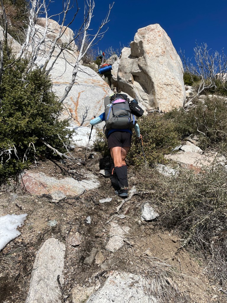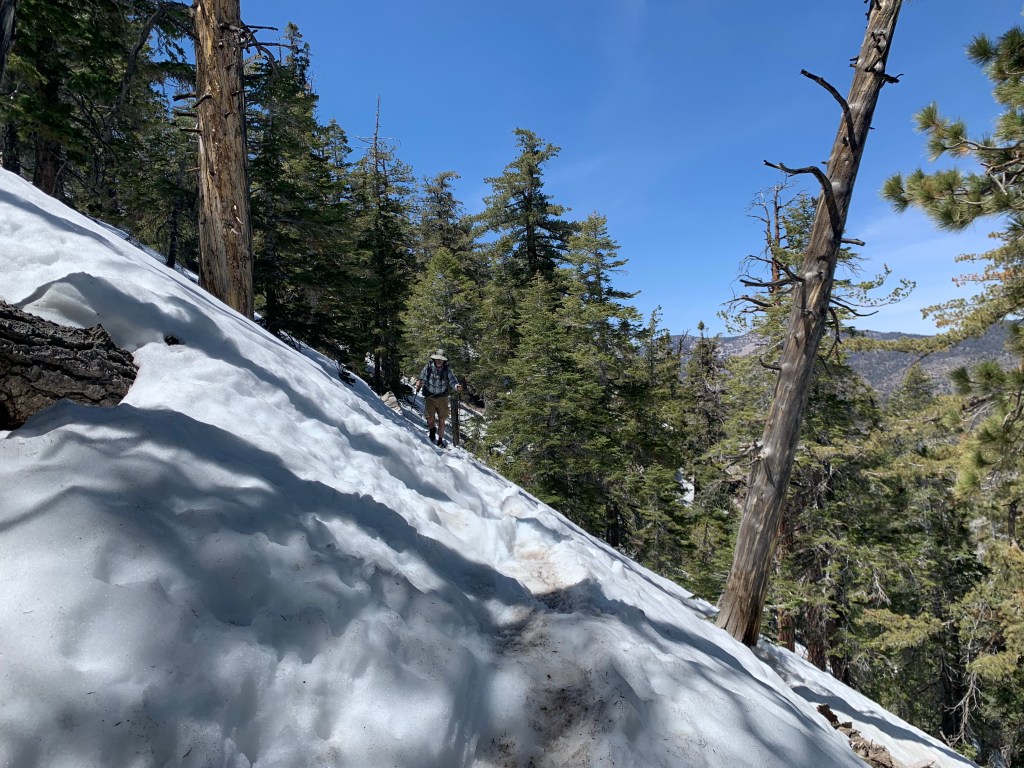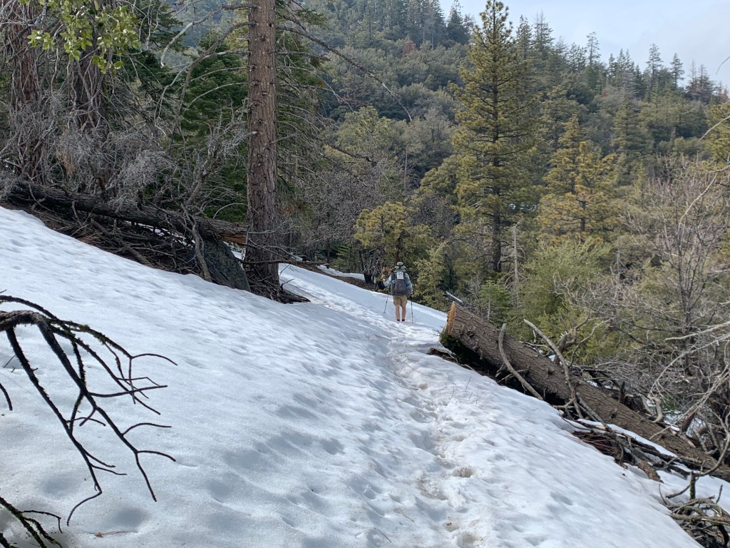 From camp we hiked 6.5 miles up to Mt Laguna over 6000 ft elevation, into the pines and some areas of lingering snow. A week prior hikers were postholing in the snow. Now most of the snow was gone.