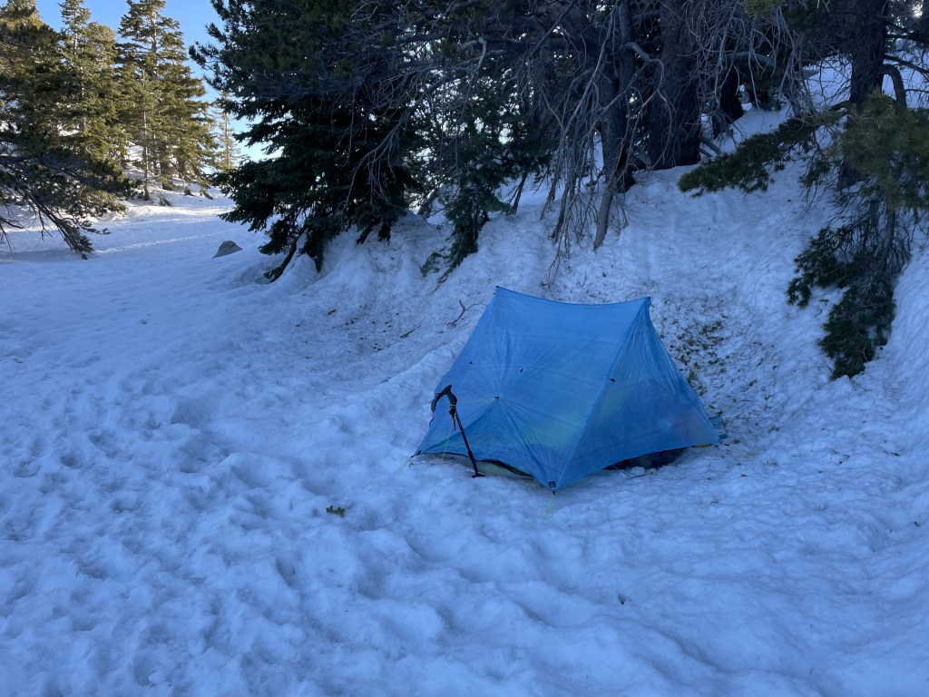 Our goal today was to hike as close to the Paradise Valley Cafe as possible, but first we had to deal with a cold morning and our frosty tent. The cold air settles into the low areas and boy was it cold! We didn’t have a thermometer, but based on how quickly things froze, we figured it was in the high teens Fahrenheit. However, after just a short while on trail we were in the sun and had stripped off the layers.