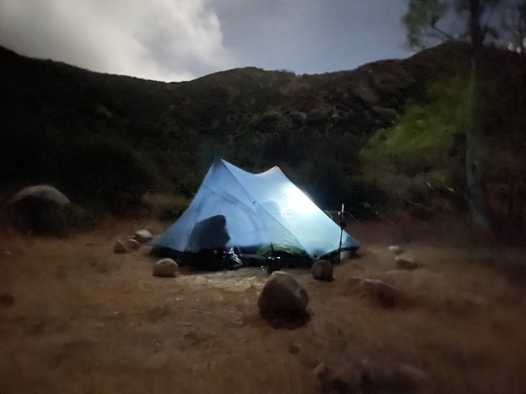 Climbing up to about 5300 ft we found a perfect tent site under a large tree and with a trickle of cool water nearby.