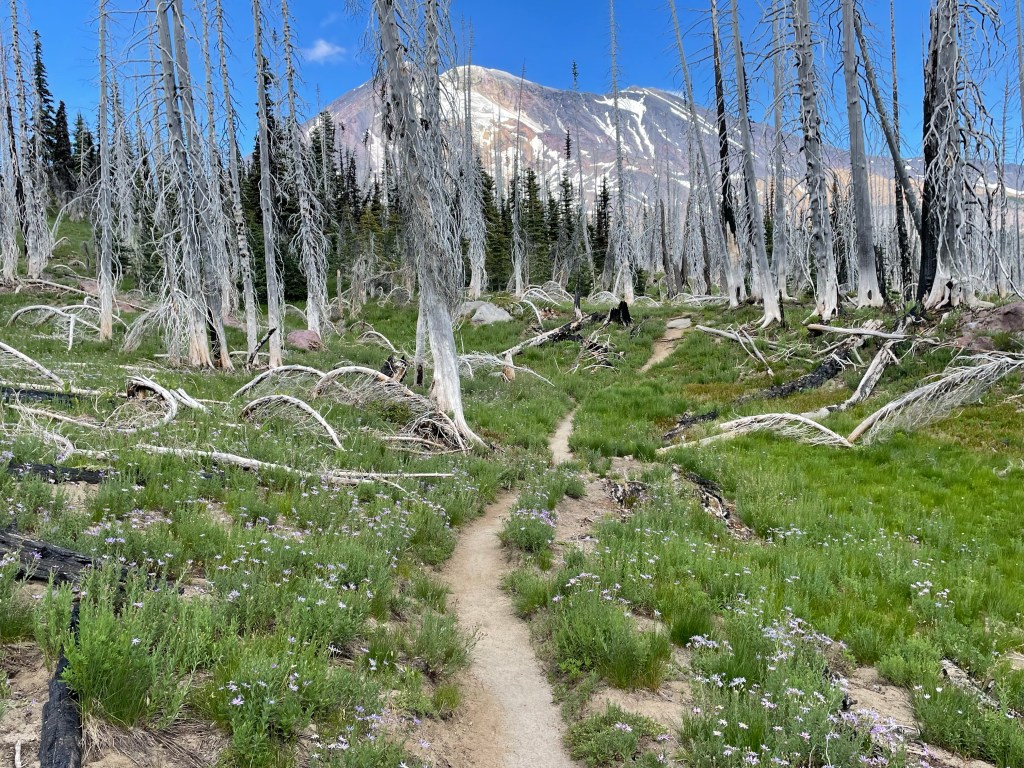 We continued to walk on a traverse facing west in a burned area. This allowed us to have some views to the west of Mt. St. Helen and other distance mountains. It was really nice to have something else to look at besides trees and bushes.