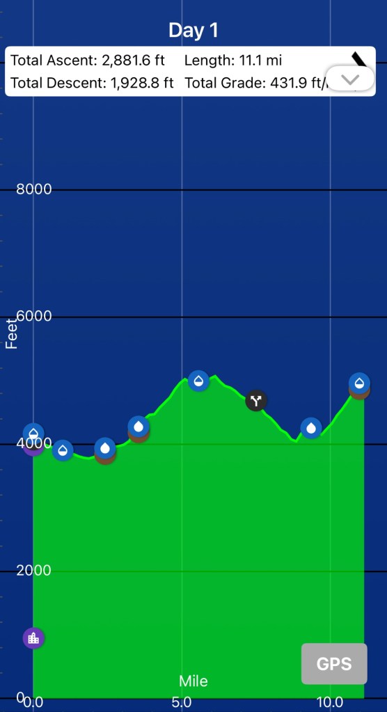 Start: Trout Lake rd – 2231.6 End: Riley’s Creek – 2241.8 Miles: 10.2 Ascent: 2466 ft| Descent: 570 ft