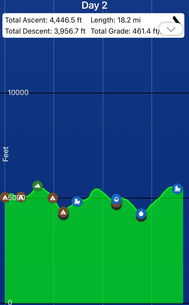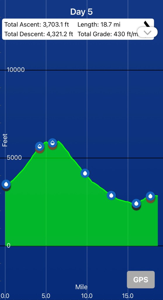 As is always the case, the last couple of miles of the day always take forever. We had to do one more set of uphill switchbacks and then it was downhill with another uphill bump.