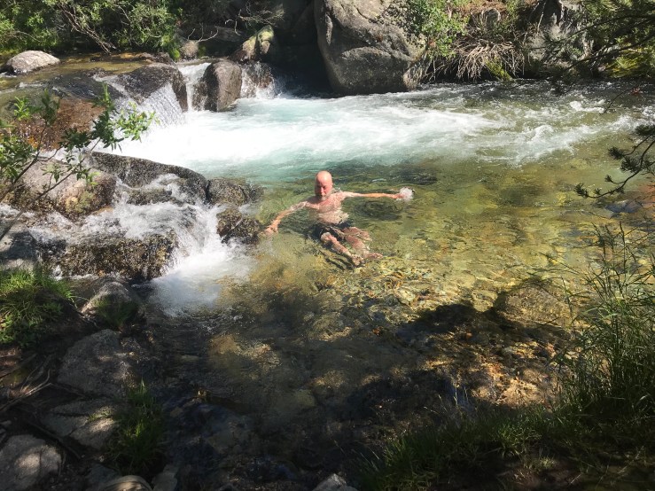 The last four miles should have been done quickly as the terrain was nice and only slightly uphill. However, it was very hot and muggy. Around 4pm we caught up with Josephine who had stopped at a lovely campsite next to Glacier Creek and just before the famous Golden Staircase.