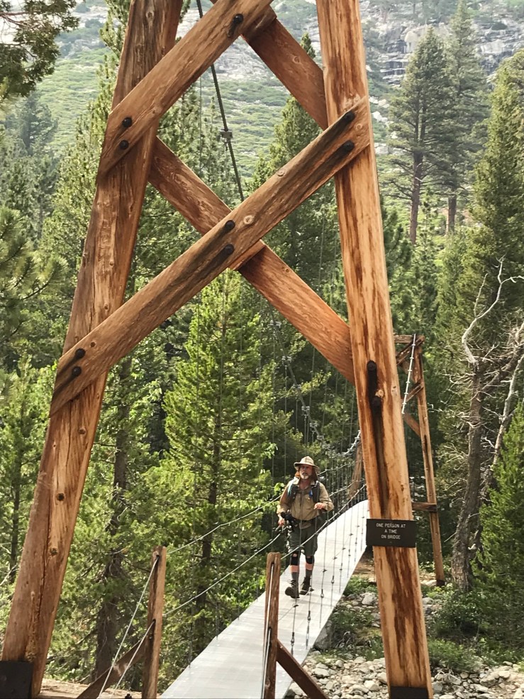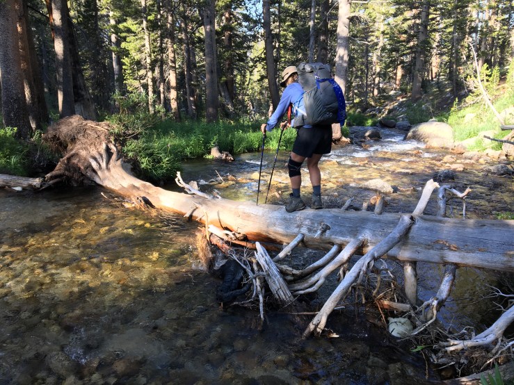 We got started what seems to be our usual time of around 7:30 am. Right out of the gate it was time to cross the infamous the South Forks Kings river and it got our adrenaline pumping immediately! We crossed over on a pretty sketchy log. Ellen froze about halfway for about 10 seconds and then made it across fine. During Jeff’s crossing his shoelace got caught and he almost lost his balance.