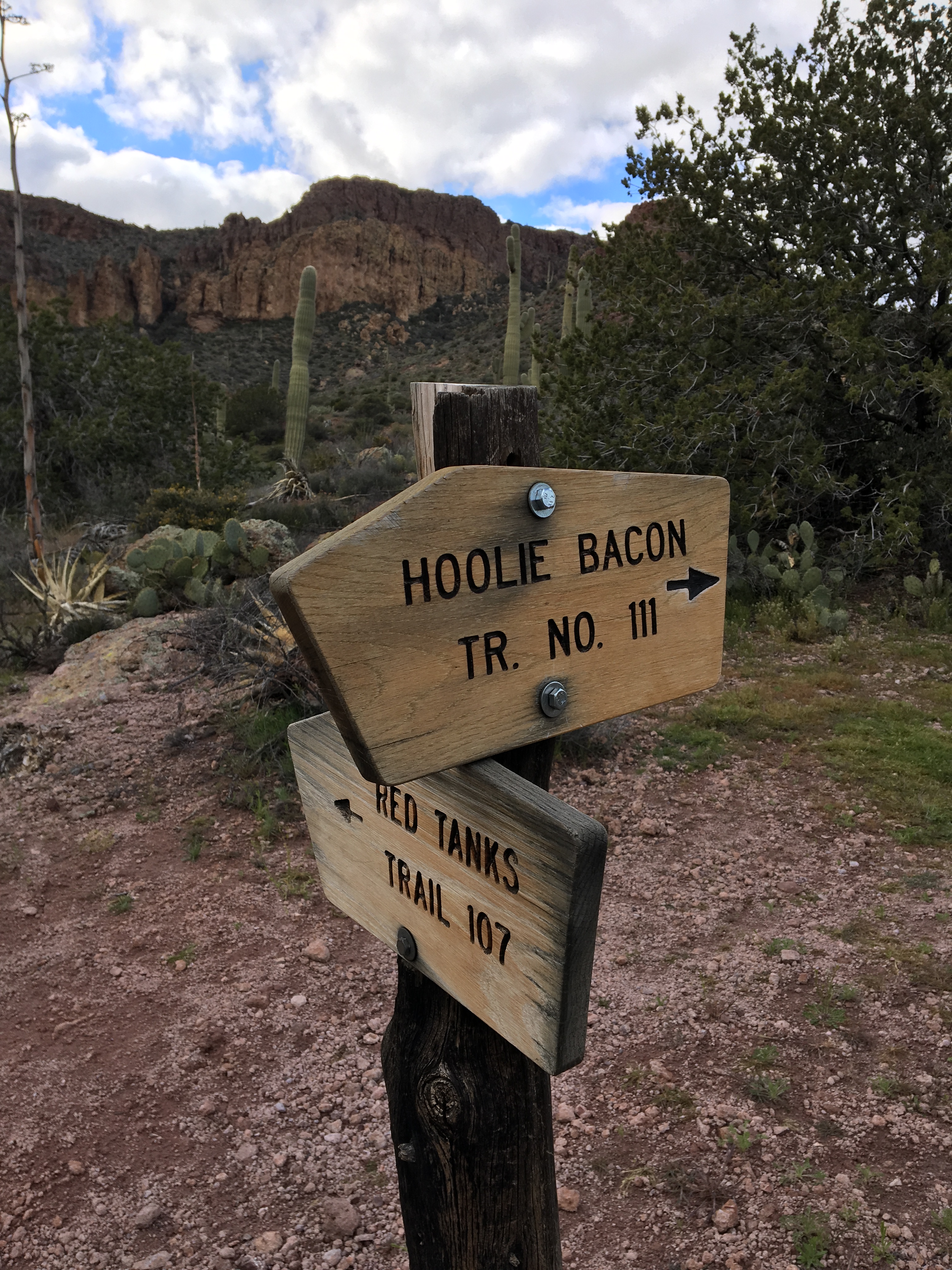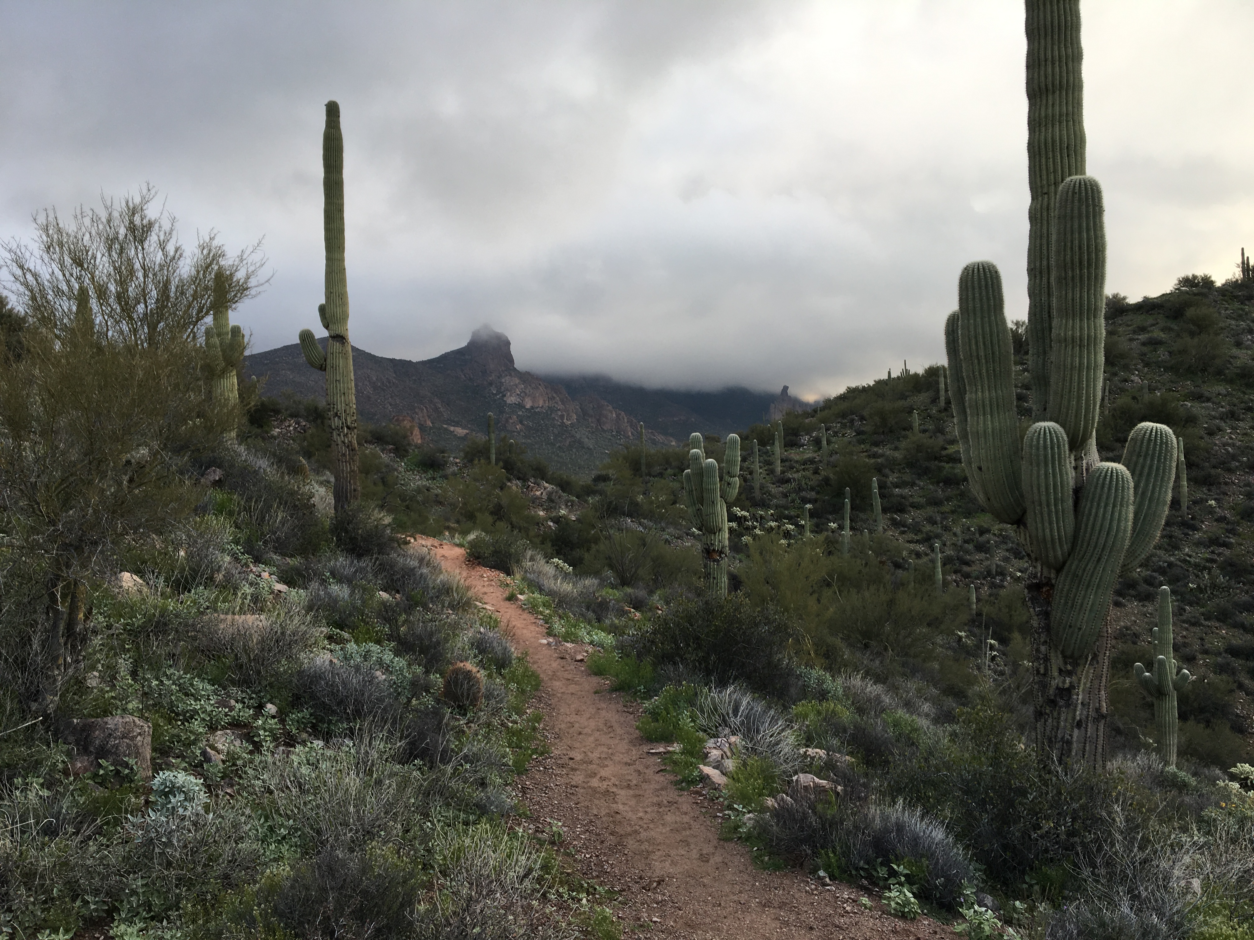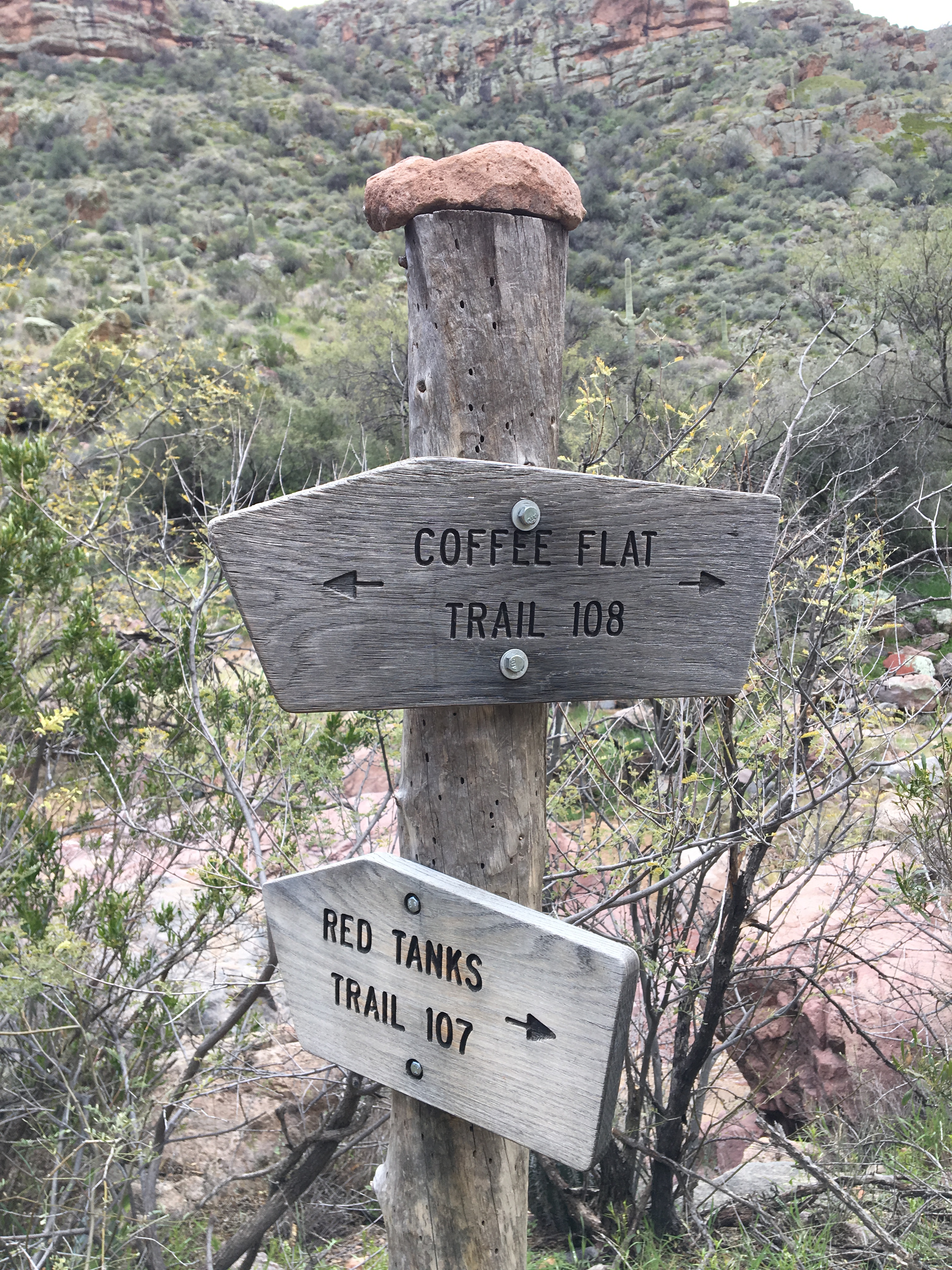 With all the rain, the desert was very green and lush. Within a couple of weeks the desert will be in full bloom. The whole lower desert area was full of giant Saguaros. After another 4 miles through Randolph Canyon we were at the intersection of Coffee Flat trail and Red Tanks trail.