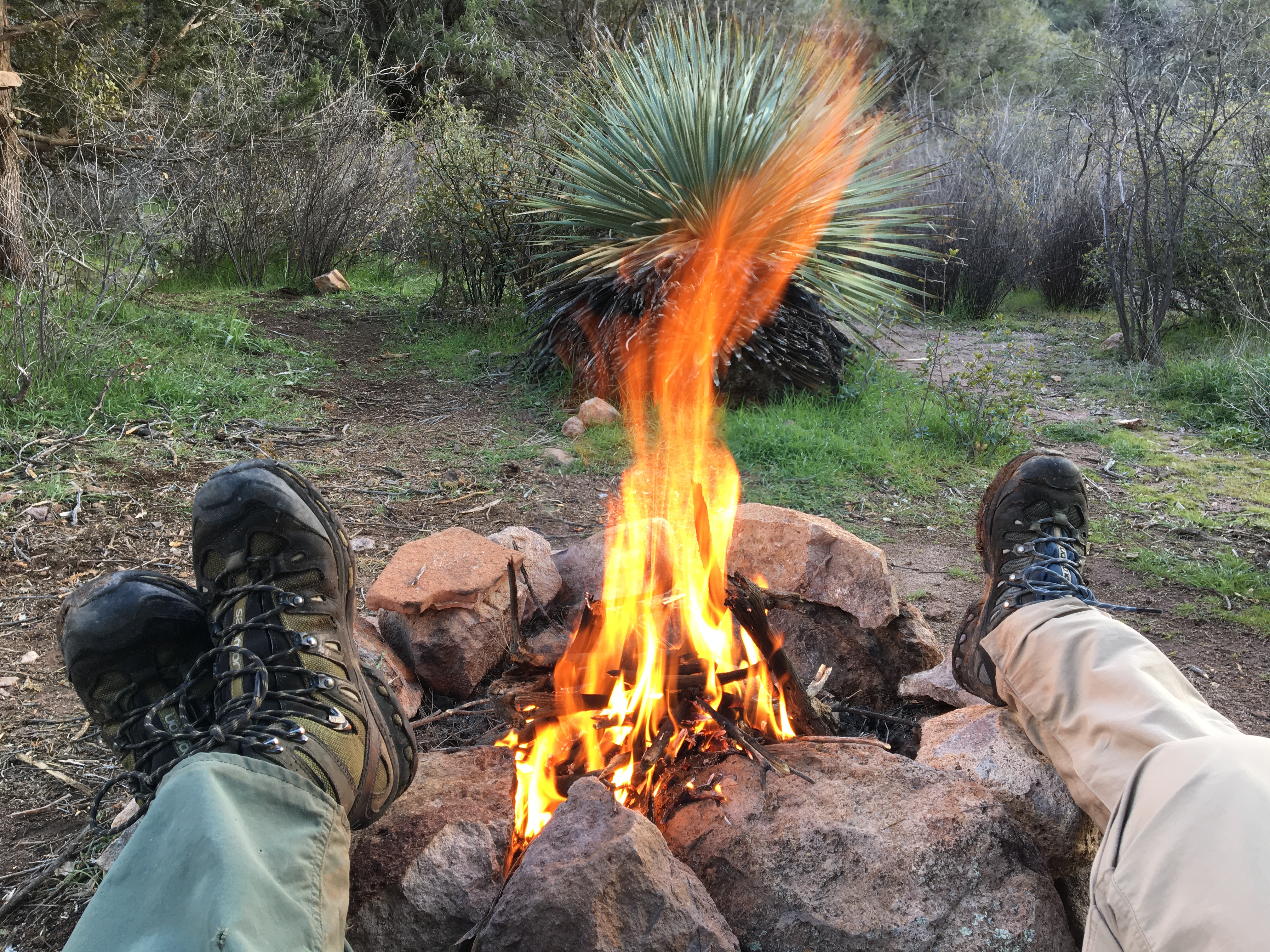 Red Tanks trail was very rugged that had not seen the trail maintenance crew yet this year. Lots of up and downs. After 4.5 miles we made it to the junction with Upper Labarge Canyon and it was time to find a camping spot. We saw some nice site, but surprisingly they were taken. We took the Hoolie Bacon trail for about 1 mile and found a really nice spot with a nice fire pit and plenty of wood in the area. After setting up camp, eating dinner we sat by the fire for a little while. What a nice treat. We went to bed at hikers midnight of 8:30 pm.