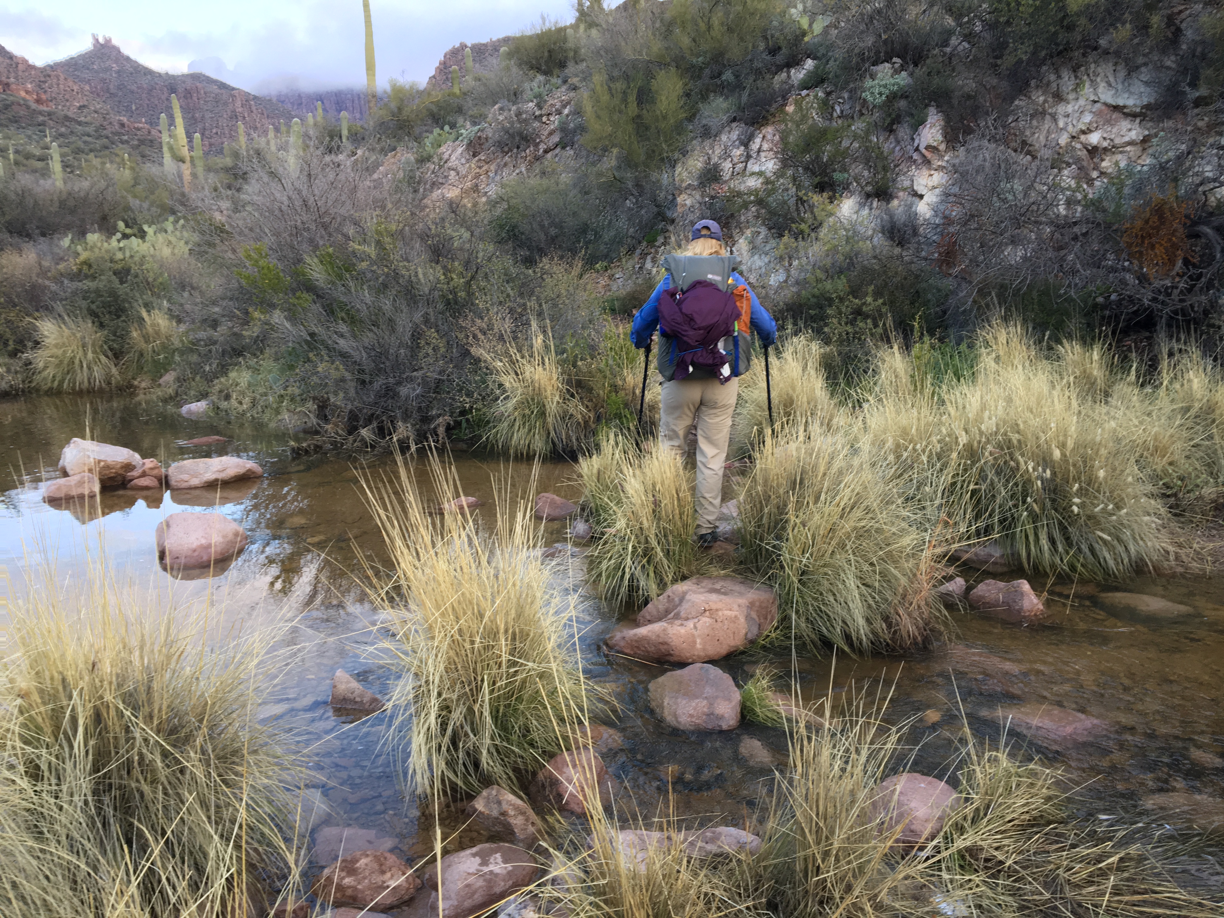 The weather in all of Arizona had been more than unusually wetter and colder. Thus all the normally dry creek beds were all flowing with lots of water. No worries about conserving and finding water on this trip. Something we were not expecting is doing lots of rock hopping across creeks as the trail winds back and forth across creeks.