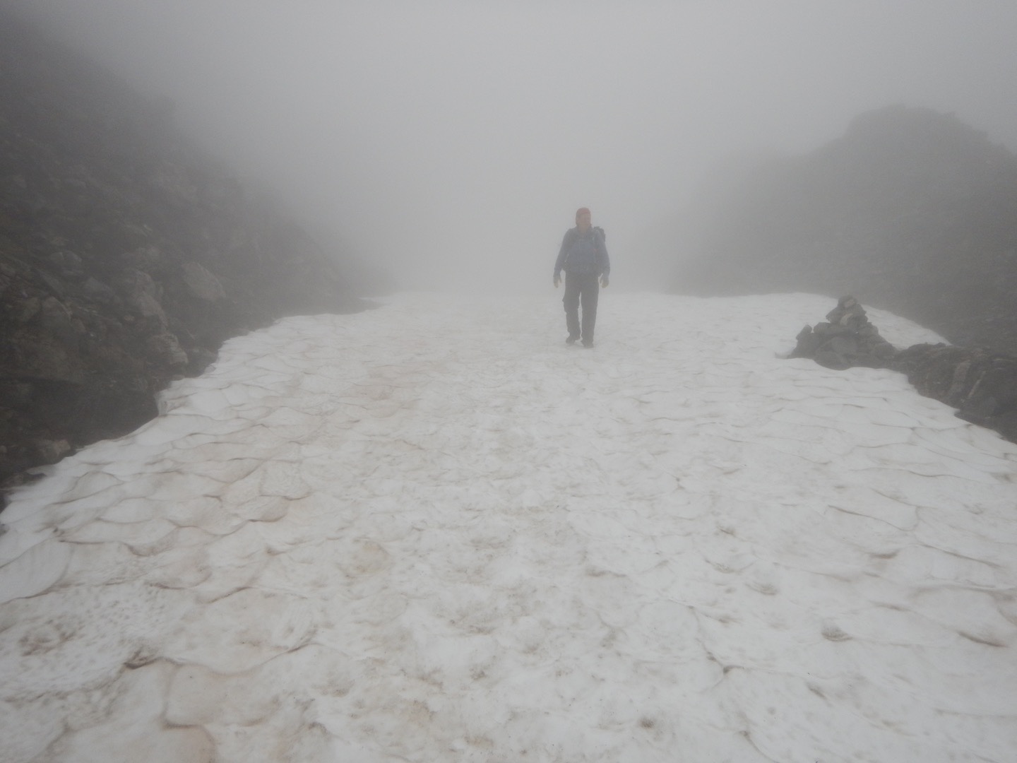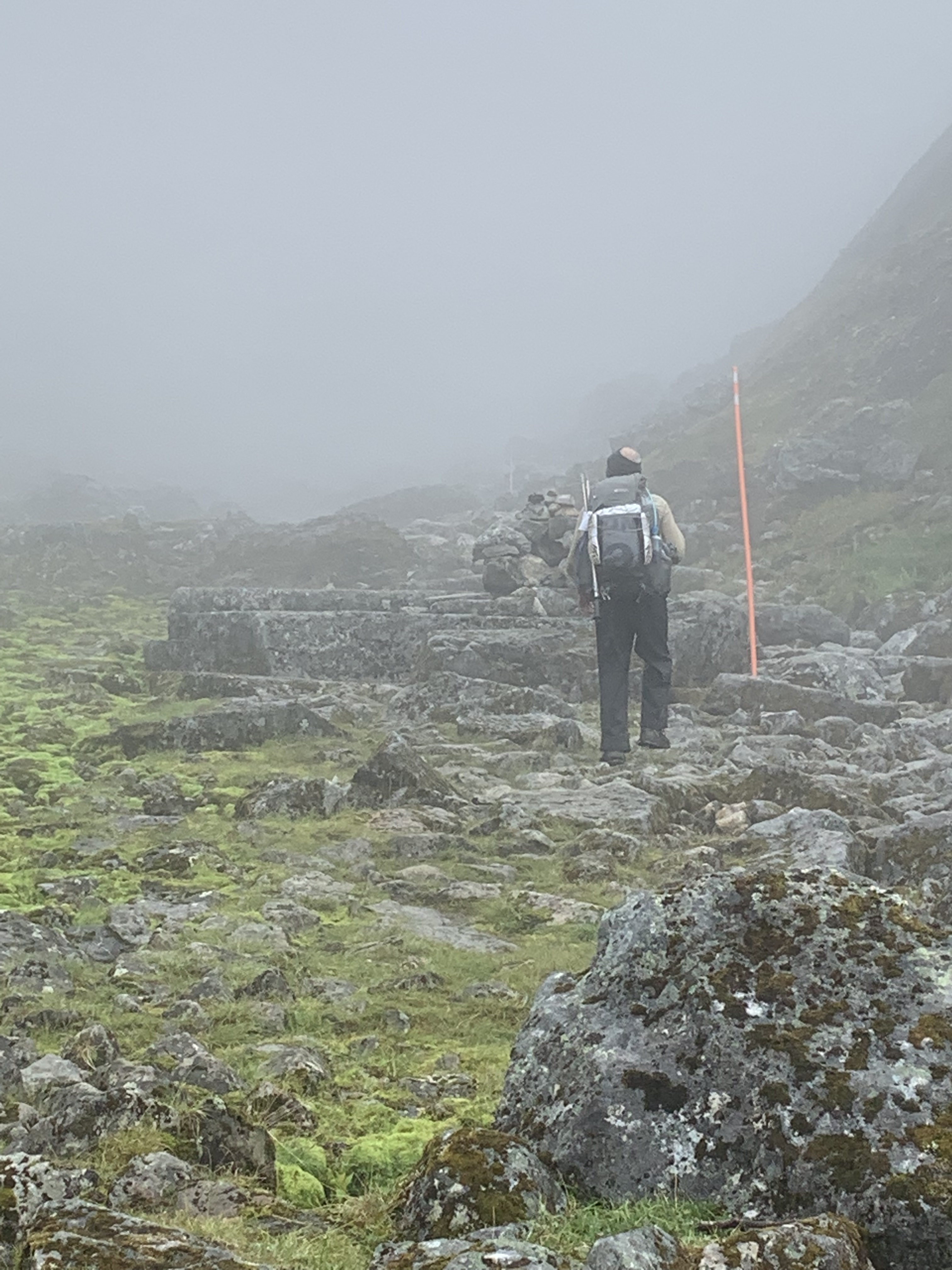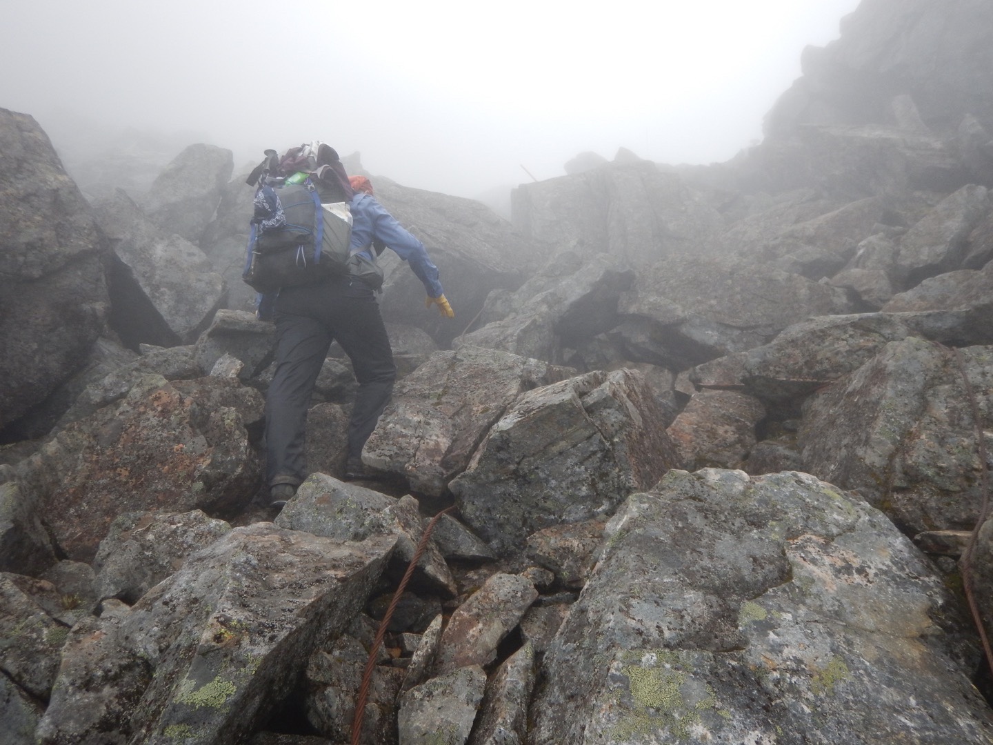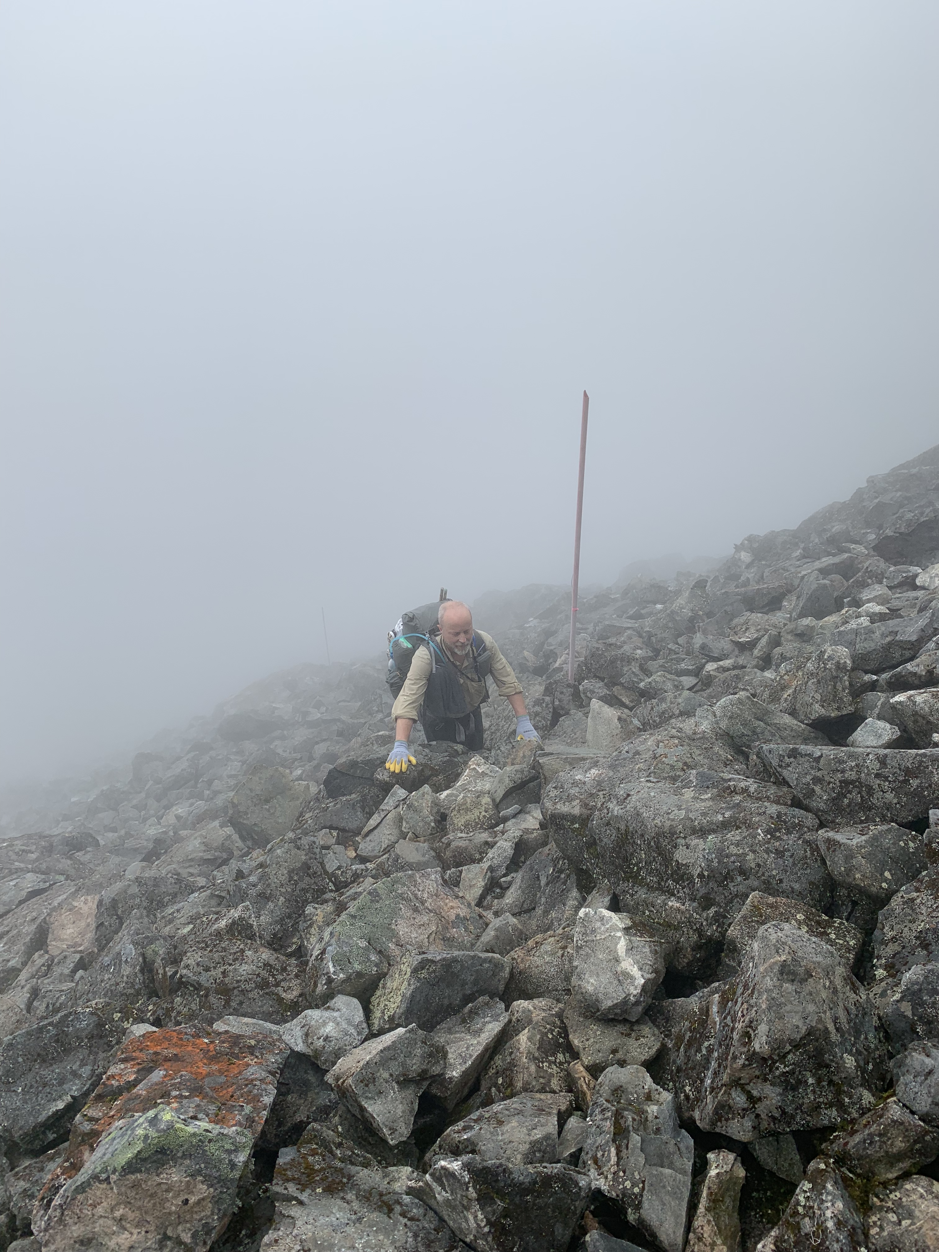 Now we came to the “staircase”, a steep 45 degree bolder strewn chute one half mile in length. It is steep enough to require scrambling on all fours and the fog was so thick that we could not see far ahead.