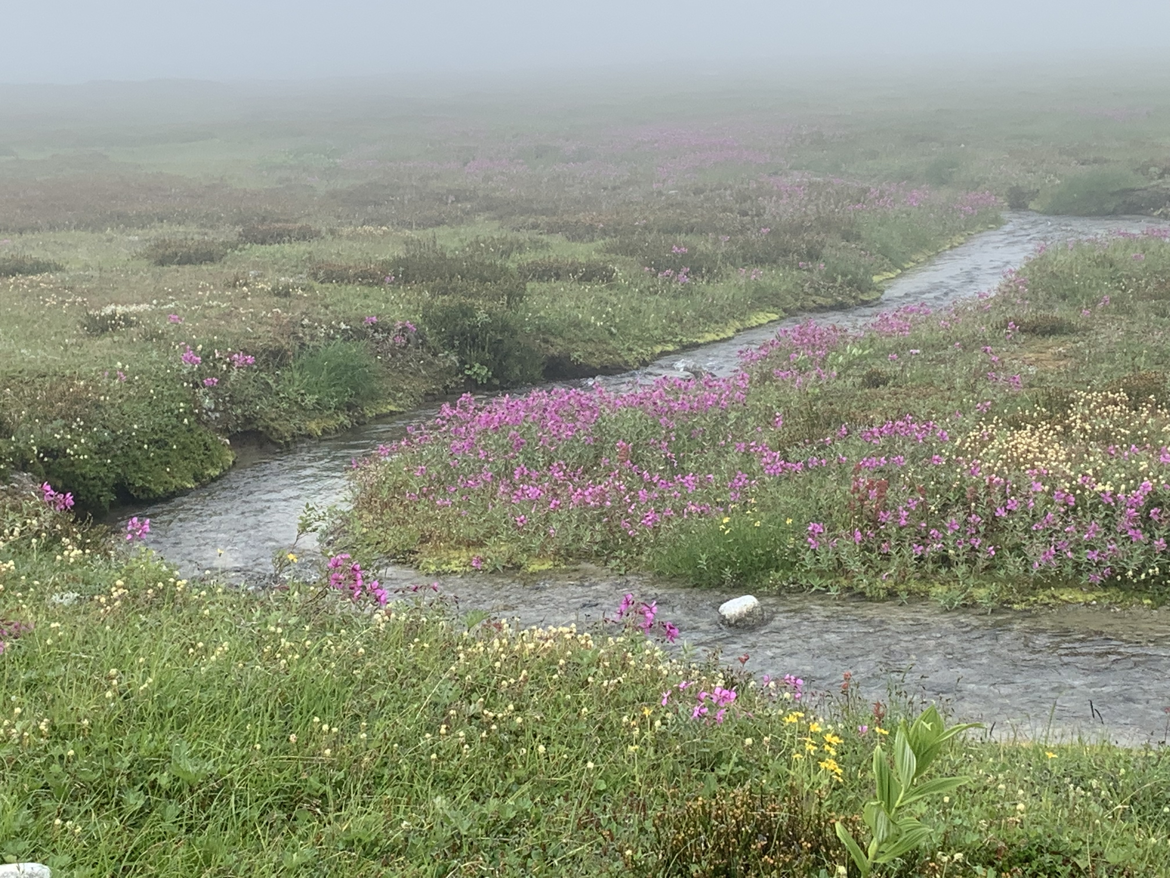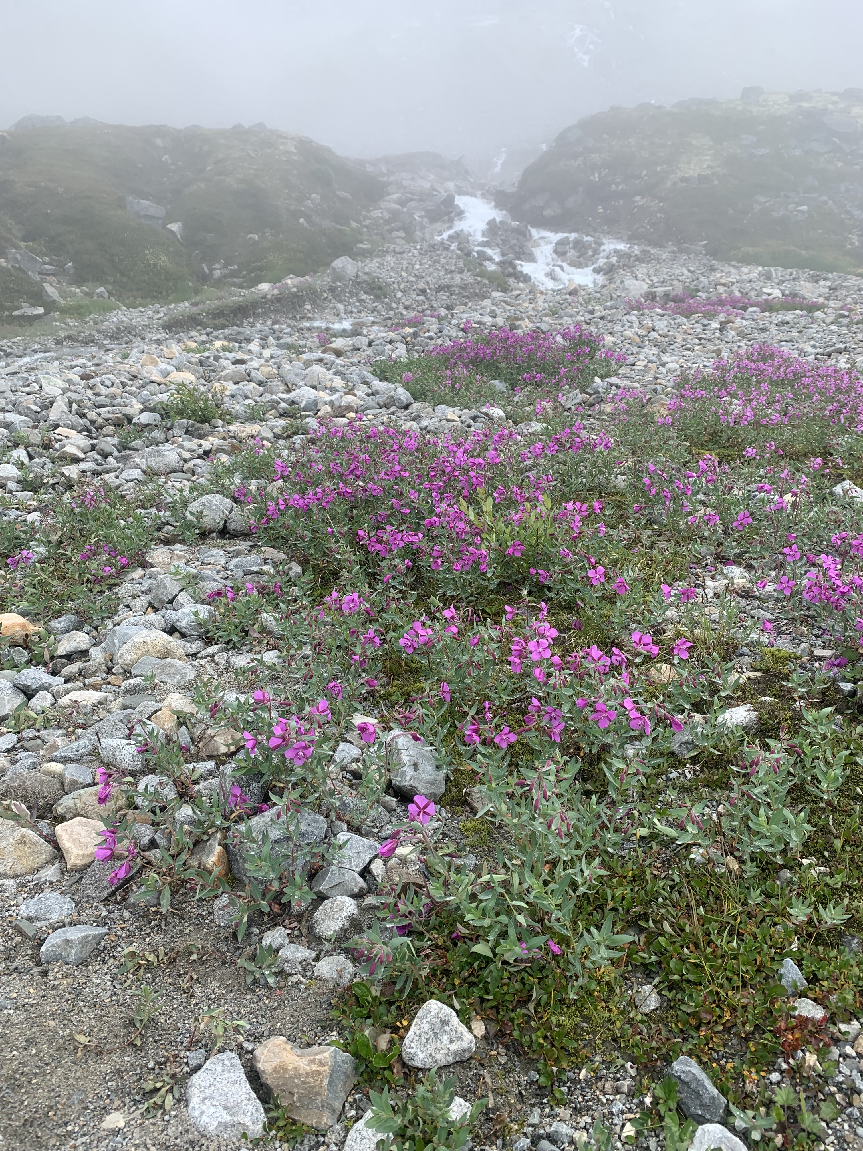 All the reading we had done about this trail did not describe conditions over the pass. The first section was very steep and rocky with slippery snowfields. The fog limited visibility to maybe 40 feet. As we broke out of the fog the trail continued through more talus fields, rock gardens and beautiful purple wildflower fields.
