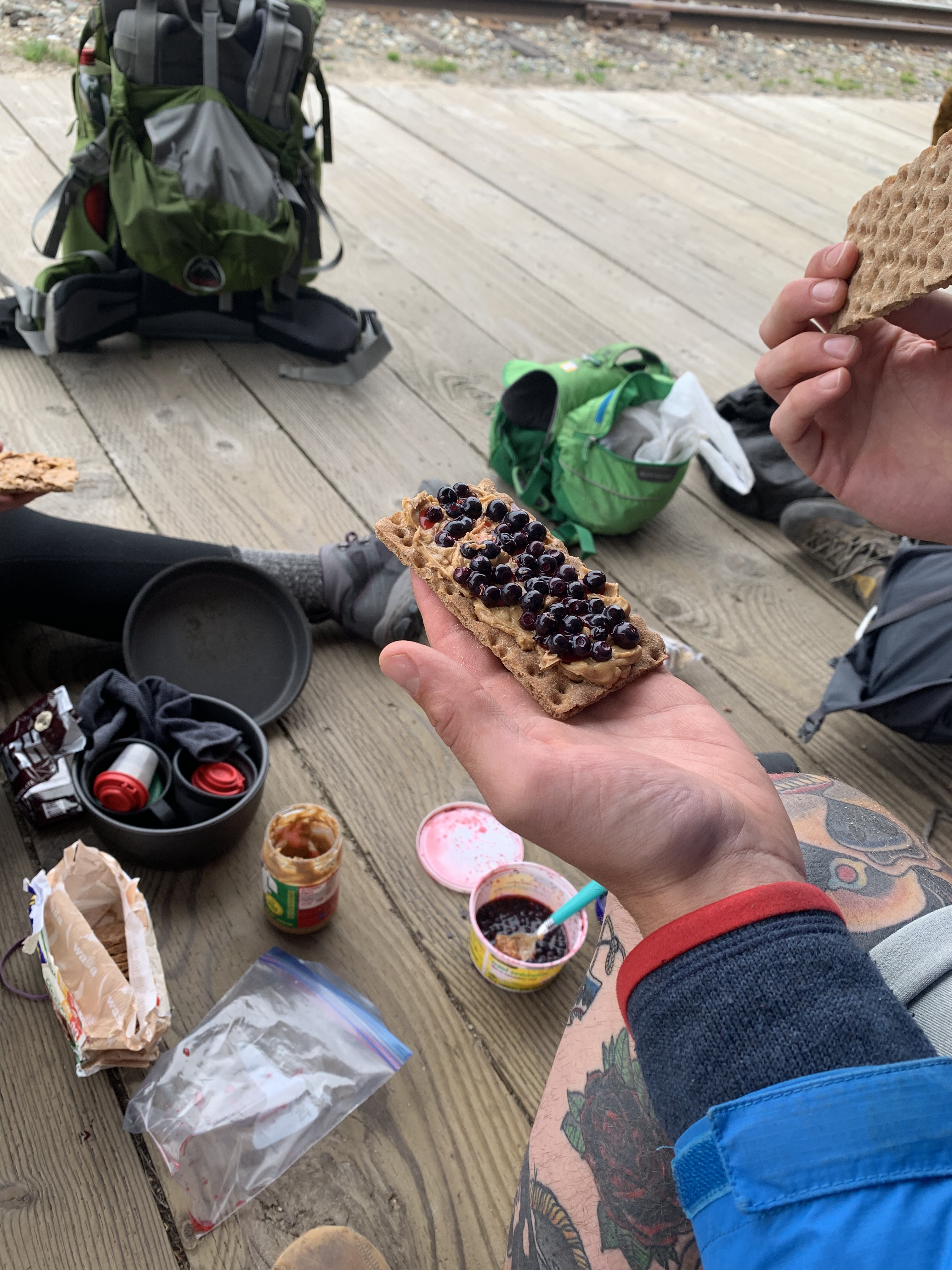 We made it to Bennett train station around 11 am. The train did not come until 2:40 pm so we sat around and waited for the rest of the hikers. It was cooler than we anticipated and we were all getting hungry. Time to bring out the leftovers. Ellen decided to boil some water and make some Idahoan instant mashed potatoes which she shared with other hikers. Eric and Mary-Jill had some leftover blueberries they picked from the trail and made PB&J crackers. Jeff shared a beverage with another bourbon lover hiker overlooking the lake. It was a feast.