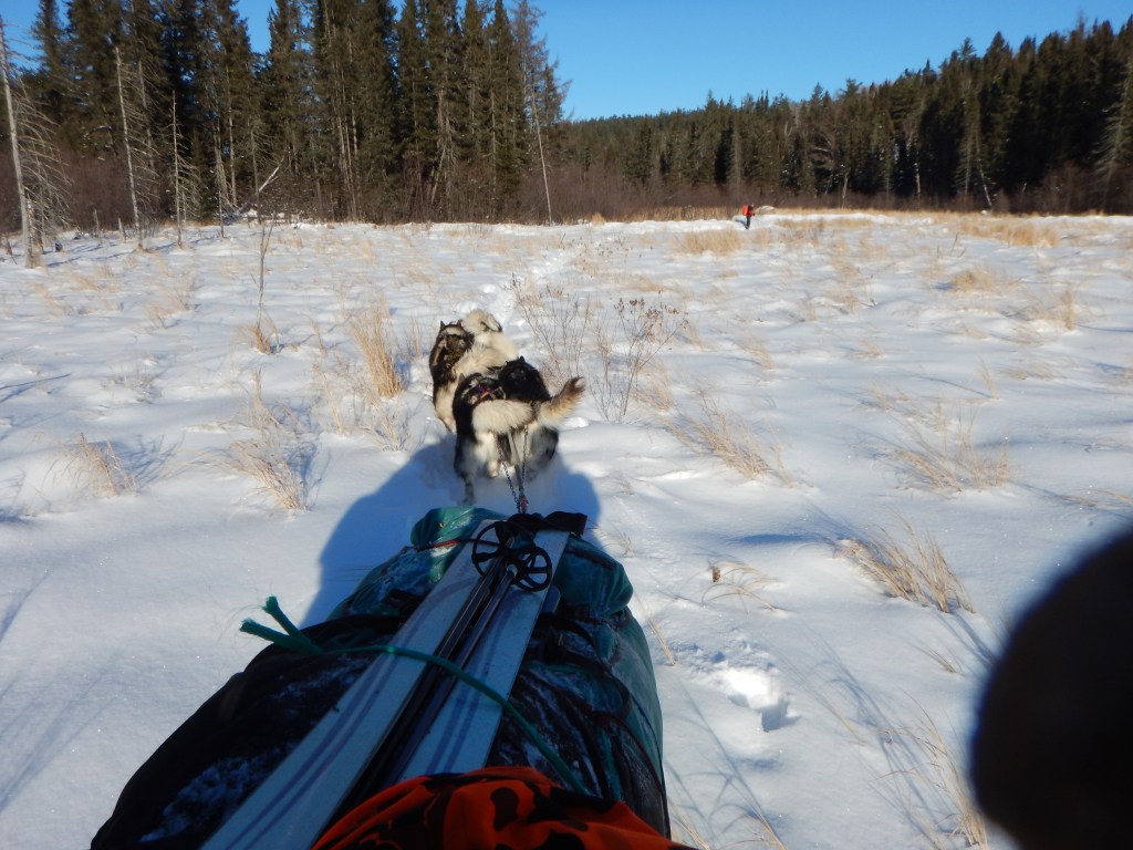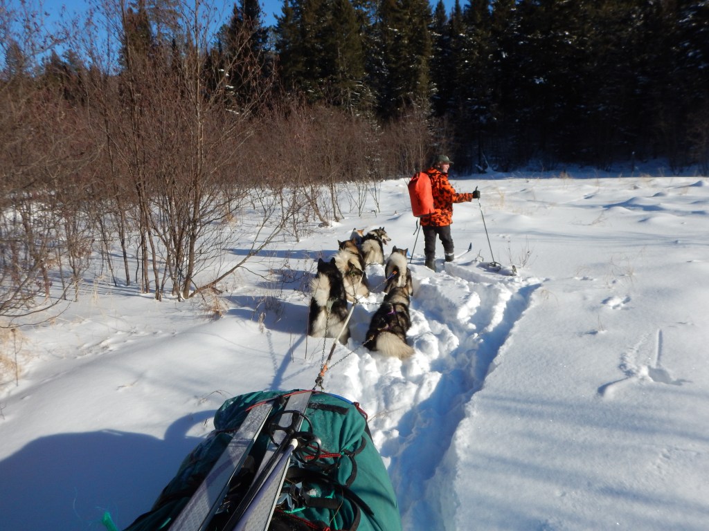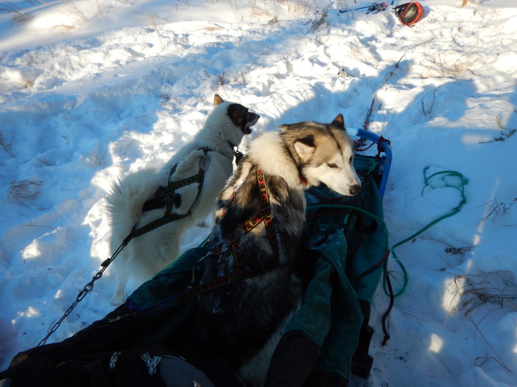 By 8 pm we were all tired and the fire was burning down. Thirty minutes earlier we had filled one liter bottles with boiling water and tossed them into our sleeping bags. We saved some kindling and fuel wood for the morning fire and each went to our “bivy sacks”. We were apprehensive about sleeping out in the meadow with only this winter sleeping bag directly on the snow, but our Wintergreen guides assured us we would be warm … or at least safe. The moon was full in the clear sky and brightly lit the meadow. As our body heat warmed our sleeping bags we studied the stars and watched satellites pass overhead. At some point we heard a pack of wolves very close by and after a brief pause our dogs joined in with quite a chorus! In the morning Paul called this the “wilderness cantata”. He explained that our Canadian Inuit Husky dogs are the domesticated dog breed closest to wolves. What messages were exchanged between these canine cousins?