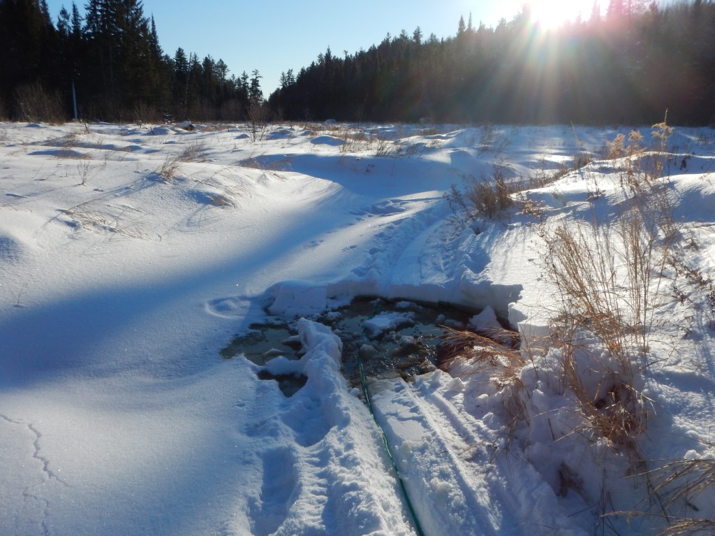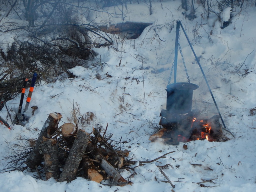 At times our heavy sled would make the creek ice snap and pop under the weight. The danger here is that the water level usually drops after the initial winter freeze. This creates an air gap between the thin ice and the water flowing underneath and so the ice will not grow thicker. Just before we arrived at a place to camp we broke through this ice shelf and our feet dropped into the water. Fortunately the sled itself did not break through and with a shout of “ready … hike!” our dogs pulled the sled and ourselves out of the creek and over the bank. Later that evening, Jeff would break through again while gathering firewood. For safety, a warm fire is an absolute necessity here! So, after tending to the dogs, prepping a fire is always the first task when making camp. Snow was boiled to water in a pot hanging on a tripod over the fire. Dinner was pasta and meatballs.