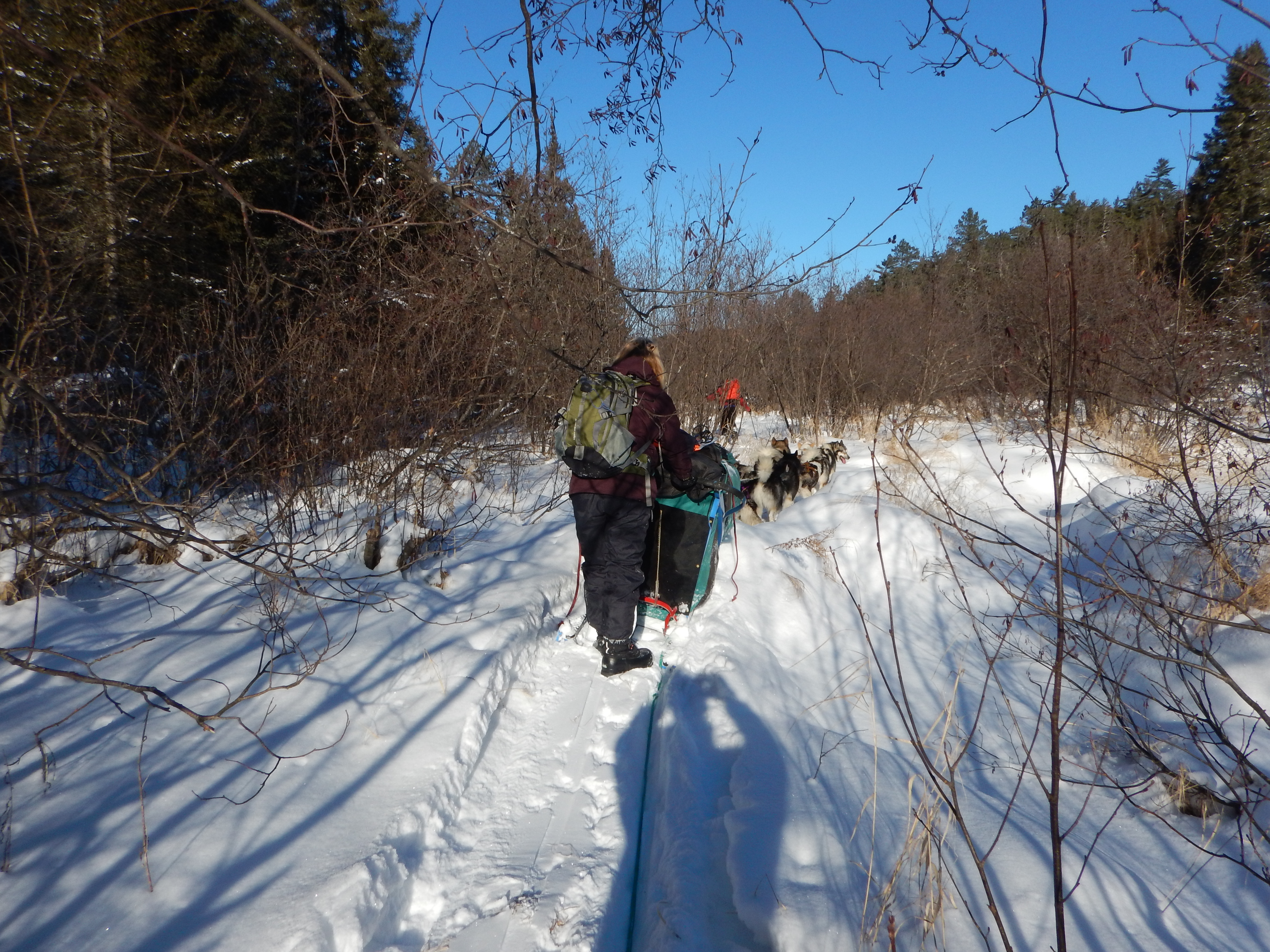 After only ¾ mile we left the trail and began bushwhacking northward through a geologic cleft toward the Canadian border. We alternated travel over the winding frozen Spring Creek, over the banks, through the snow drifted grassy hummocks, and crashing through the thick alder trees. As it turns out, dogsledding can be a very physical endeavor and one of us was sometimes scraped off the sled by a passing tree!