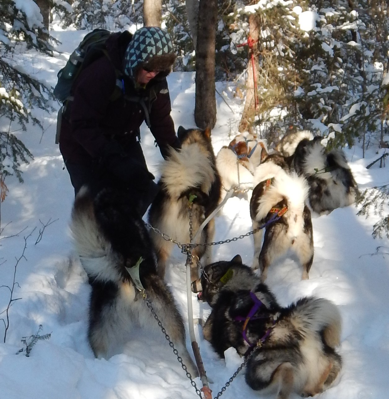 At the Angleworm Trailhead we set off one sled at a time, downhill following a hiking trail, and behind Paul who was on backcountry skis. Ellen and I together were driving a large “freighter” sled pulled by six amazing Husky dogs. Alice and Mullet in the lead row, Bronco & Bob in the middle, and little Chive and big Tin Can Mike in the rear “wheeler” positions. Two more large sleds and one small sled followed behind us. This seemed easy until our sled drifted off-trail and rolled slightly downhill into a snowbank tossing Jeff off first and Ellen landing on top of him.