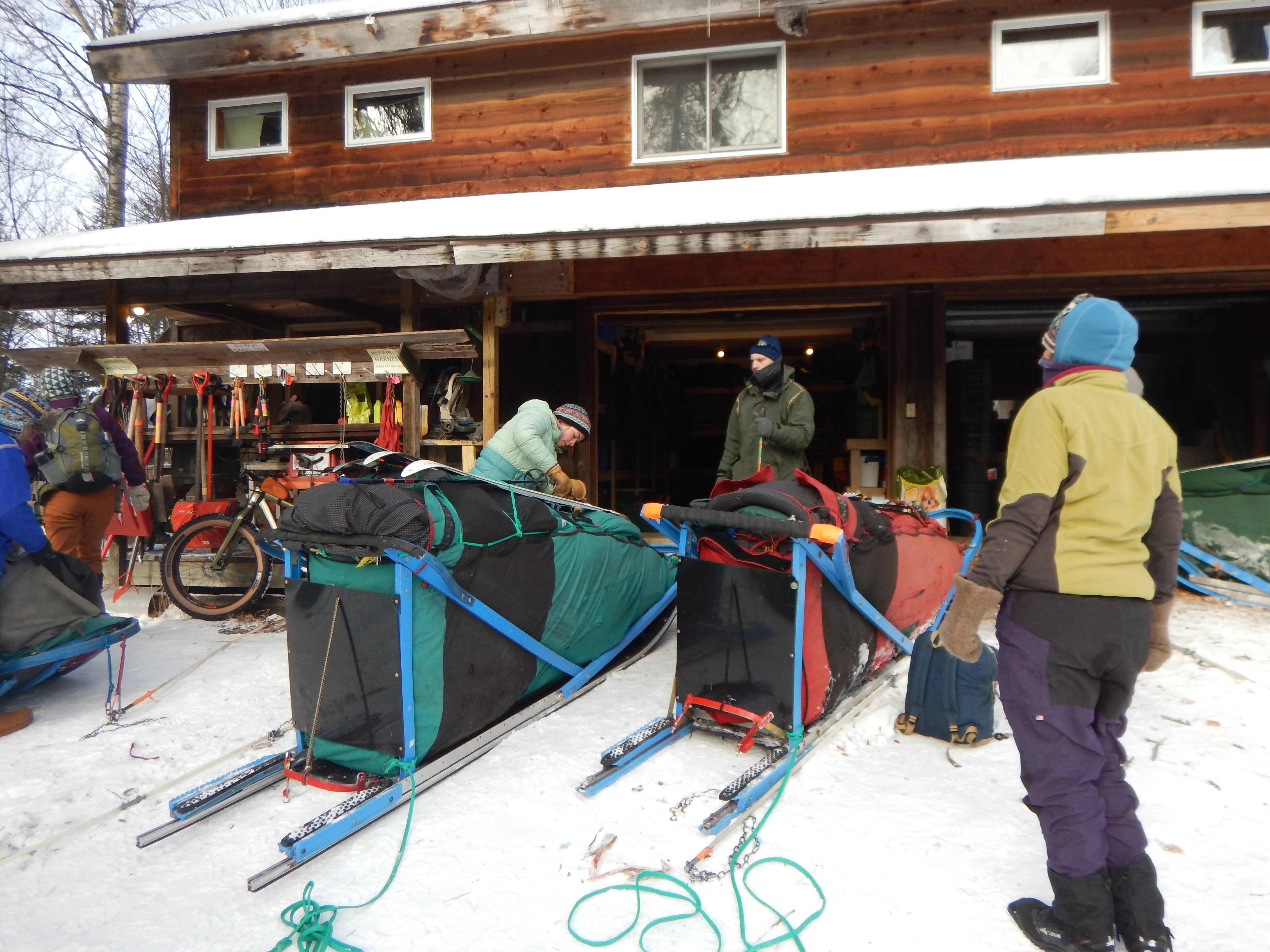 In the morning, and with very cold fingers at -10F, we all met outside the Wintergreen Lodge to pack up the sleds and dogs for the drive to the trailhead. The dogs were so excited to leave! They absolutely live and love to pull sleds and also crave the attention of their new human friends. The dogs know the drill and some were patient enough to help us novices get their harnesses on. Our guides showed us how to grab the top of the harness, pick the dog up like a suitcase, and walk them toward the trailer or the sled. In “two-wheel-drive” these powerful dogs are less apt to drag you away!