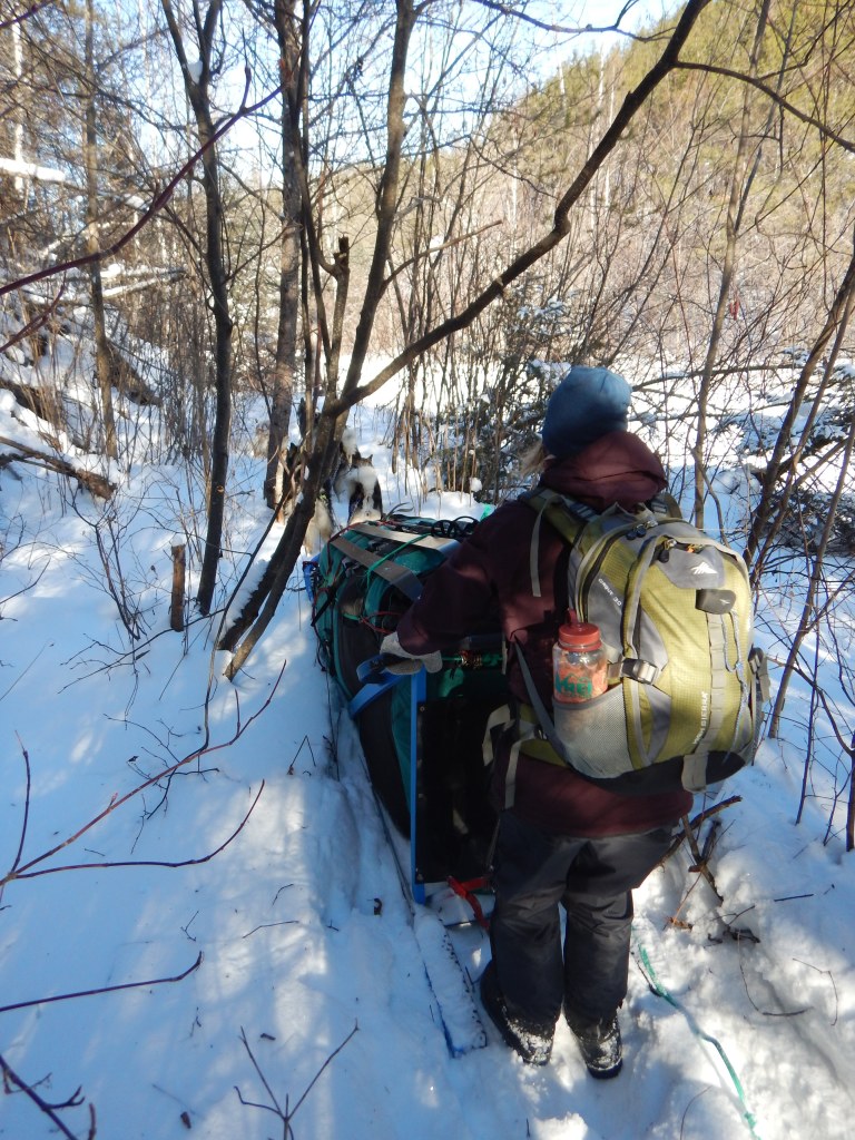 After arriving at Sunday Lake, we let the dogs run free for a long time while we gathered and cut firewood, chiseled through the lake ice for water, and started dinner. Jeff had laid out his bivy on the lake ice but while attempting to slide in at bedtime found that our lead dog Alice was attempting to enter his bivy as well! Alice is a good lead but is also a “camp dog” and often manages to avoid being chained to “the line” with the other dogs in the evening. Jeff shooed her away but then she tried Ellen’s bivy which was in the trees. Ellen reluctantly got out of her bivy and clipped Alice to the line but the device may have been frozen open because Alice soon returned to Ellen. This time however, Alice was content to quietly curl up and sleep all night on the foam sitting pad behind Ellen’s head. What a sweet scene!
