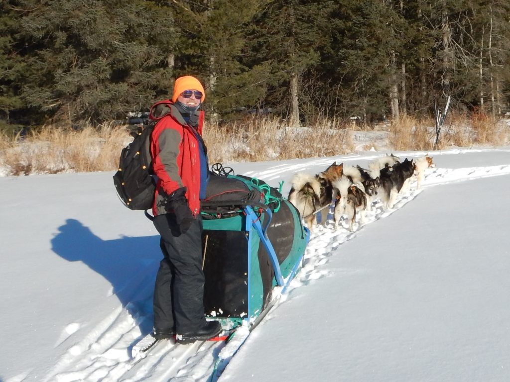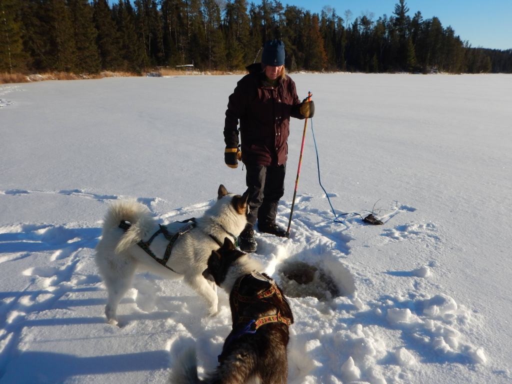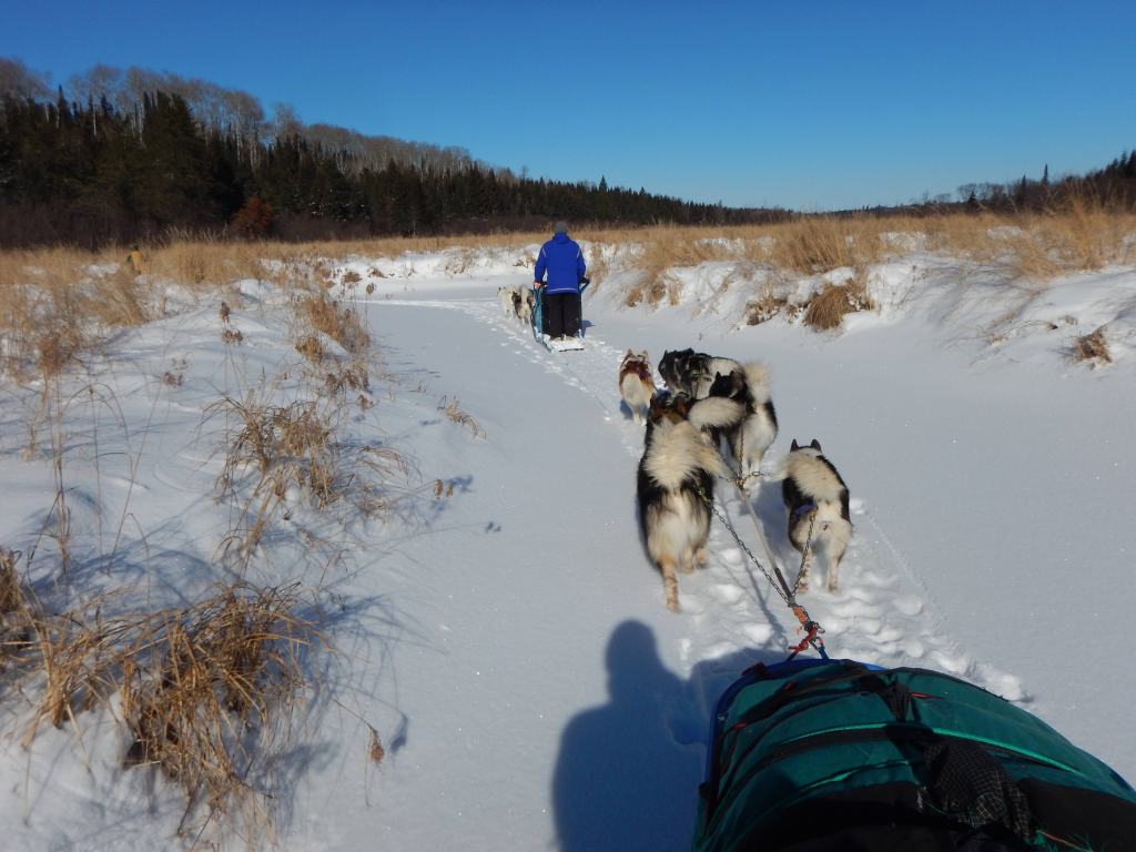 After breakfast we packed up the sleds, harnessed the dogs, and continued up the draw, now crisscrossing the frozen Beartrap River toward Sunday Lake. We came to understand that this corridor is seldom travelled in any season because it is away from the summer canoe routes and is also without hiking trails. In fact, it had been 20 years since even our Wintergreen guide had been through here with dogsleds! It began to feel like a true expedition. Our route once again followed the winding river ice while sometimes up and down the banks and over the uneven snow covered grassy expanses. On the frozen river we saw long stretches of tracks from a small wolf pack and we tried to interpret their movements. The tracks would stop periodically and show signs of chaos or struggle then continue further ahead before stopping again. At these stoppages we believe the wolves had caught some other animal and were trying to wrestle control.