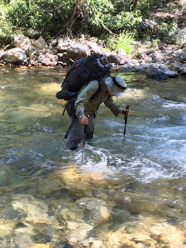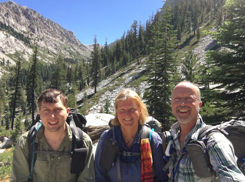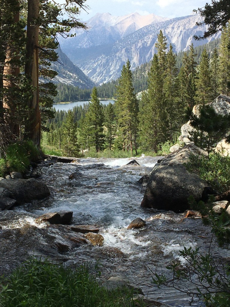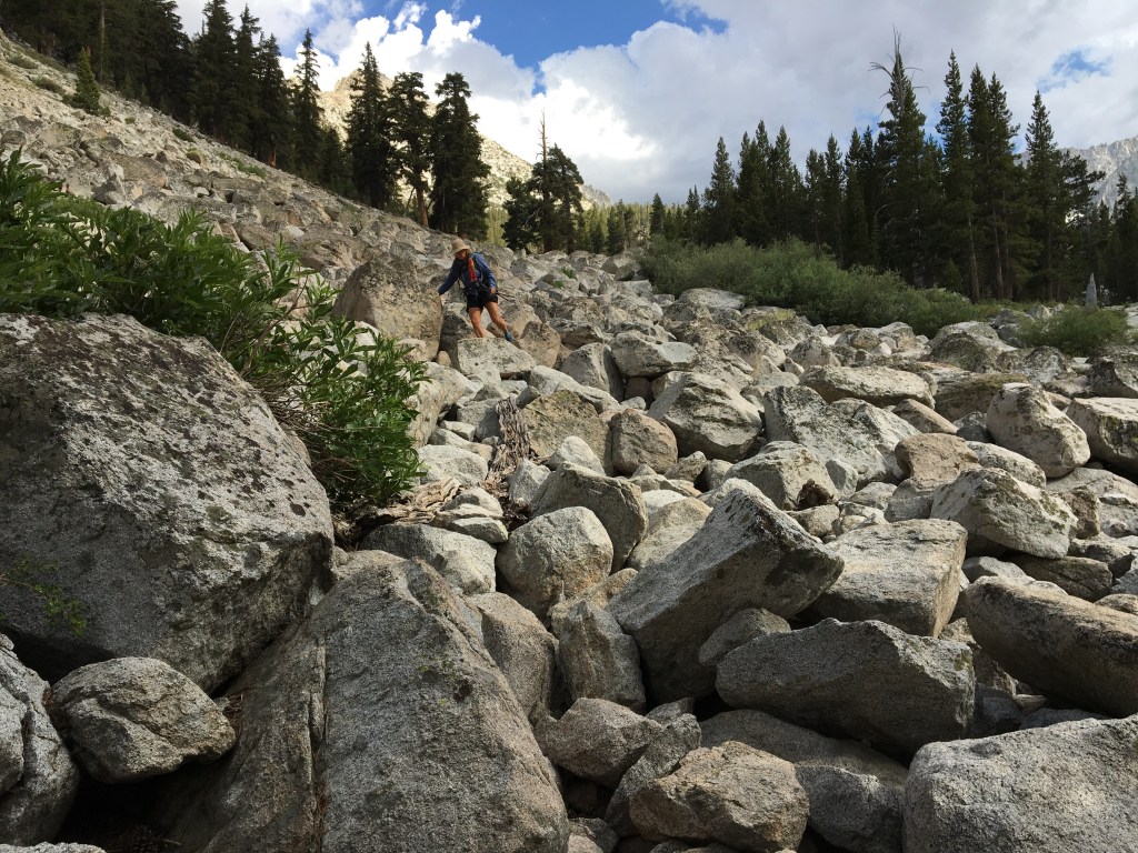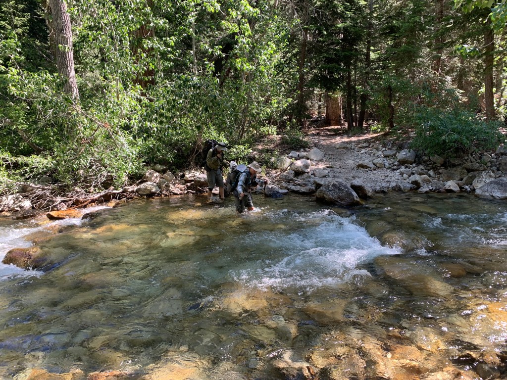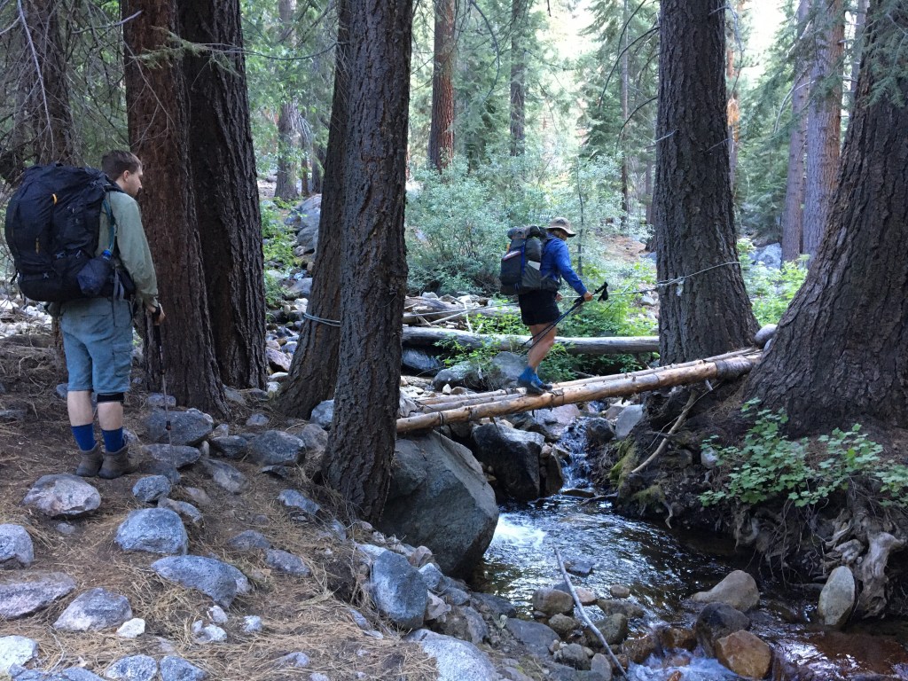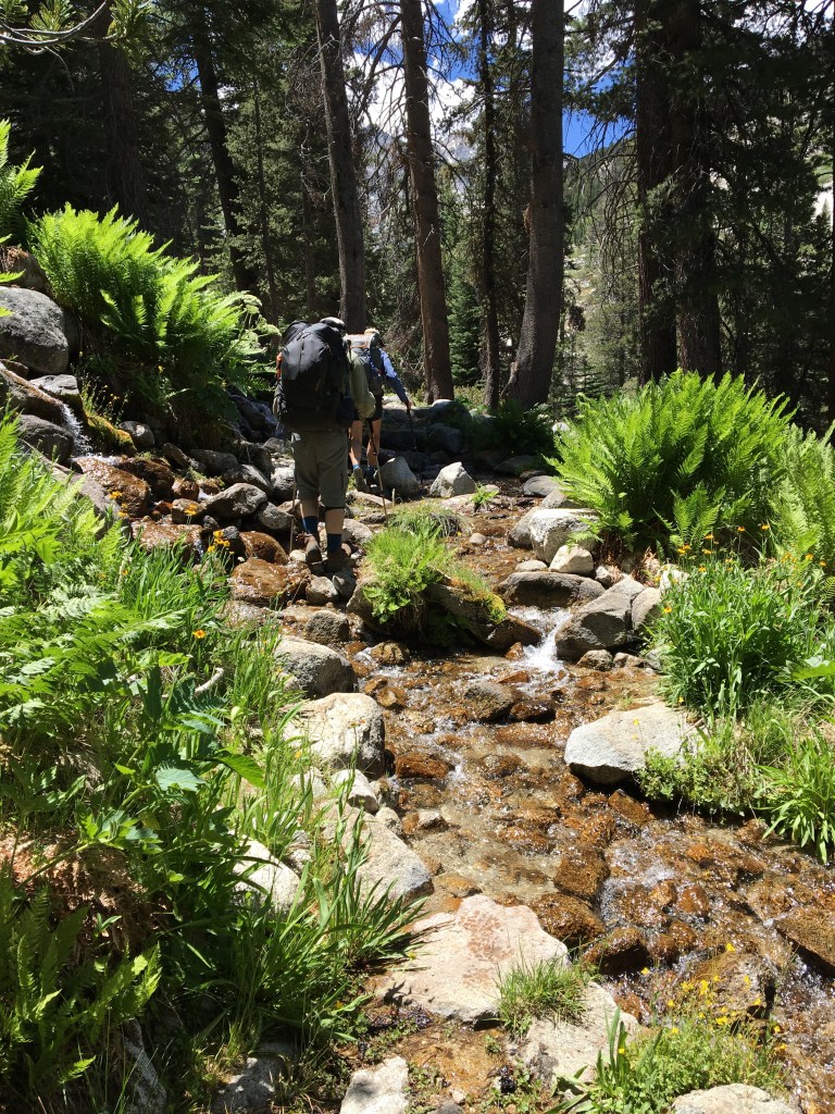 It was now a moderate climb and only 3 more miles to East Lake, but first we had to cross Bubbs Creek.  There were no rocks to hop across here, so we just waded in and braced against the fast-moving thigh deep water.  Jeff and Chris took off their boots while Ellen just walked through the water in her trail runners. The water was cold but refreshing!
