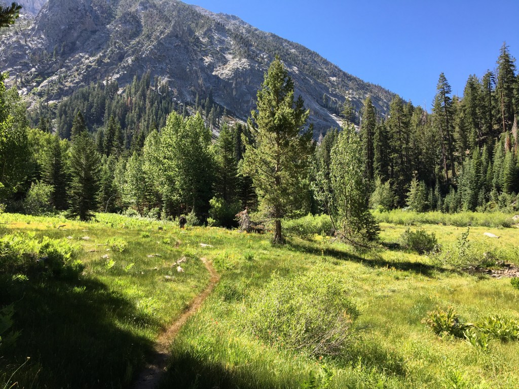 A few deer greeted us in the morning as they strolled through our campsite.  After breakfast, we packed up and hit the trail.  The hike along Bubbs creek in the morning was cool and beautiful and we arrived at Junction Meadow after about two hours.  This beautiful meadow is the junction of the Bubbs Creek trail and East Lake trail and it is full of wildflowers.  From here we could see up both valleys – one towards Glen Pass and one towards the Kings-Kern Divide.