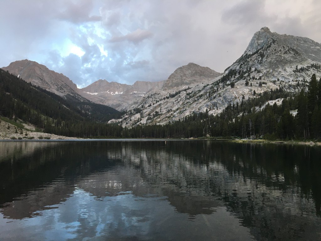 We finally made it to Lake Reflection but only spent about 10 minutes there.  The mosquitoes were swarming, it was getting late, the clouds were ominous, and we had told Chris we would be back by 6 pm.  We hustled back to camp!  The clouds continued to grow as we made dinner and we were certain we would be rained on. But only the high peaks got the rain and we stayed dry.  It was a beautiful evening.