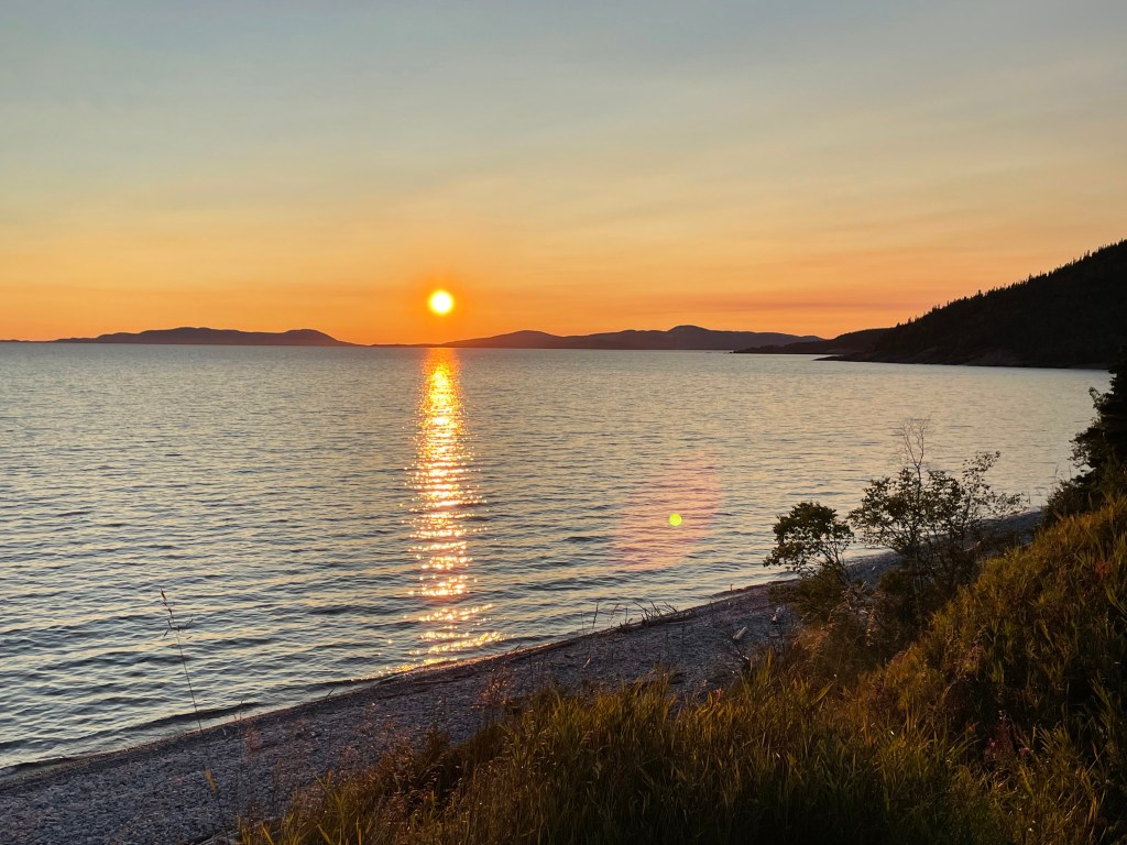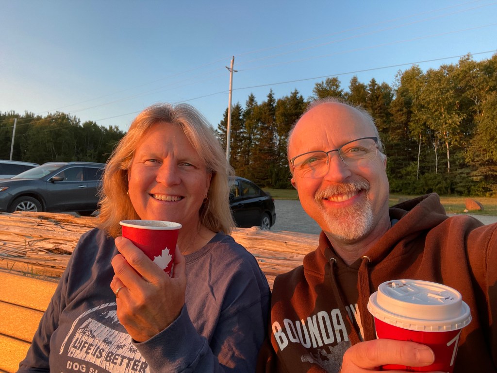 After a 10 hour day, we finally stopped in Marathon, Ontario. Dinner was sandwiches at the Tim Hortons and then quickly down to Pebble Beach to sip hot chocolate and watch the sunset. We stayed at a small but new Travelodge that had opened just two weeks prior and was lacking some furniture.