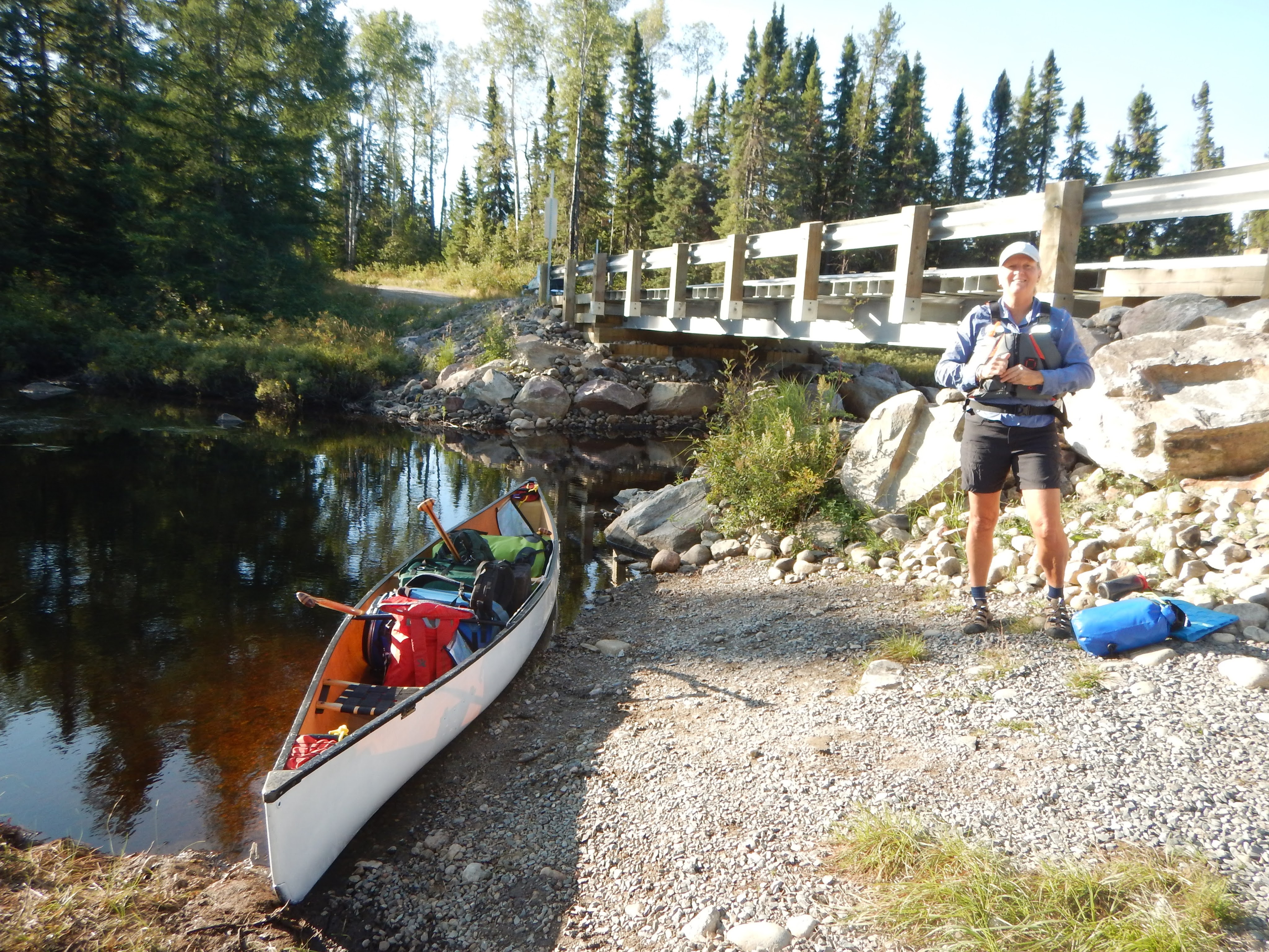 On Bruce’s advice we had decided to flip-flop our trip, meaning he would drop us off by car at the Little Caribou River, then we would paddle our 10-day route to the northwest. The day before we finish, we would use our Garmin InReach2 satellite messenger to call for a float plane to fly us out from Burntrock Lake. After waving goodbye to the Otter, Bruce drove us to our starting point and we paddled off around 9:45 am.
