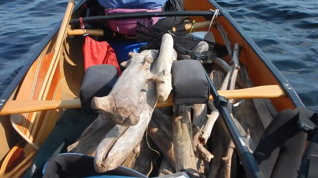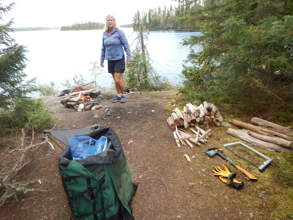 It was then time to make a big open water crossing over Little Caribou Lake and then locate our intended campsite. We arrived there around 4 pm, set up camp, and then cruised the shorelines in the empty canoe to gather good firewood. We have learned that the best firewood is always found near the waters edge. Dead or beaver cut trees fall to rest there and dry out in the sun. We try to avoid dead trees in the forest which are most often still green or decayed beyond use.