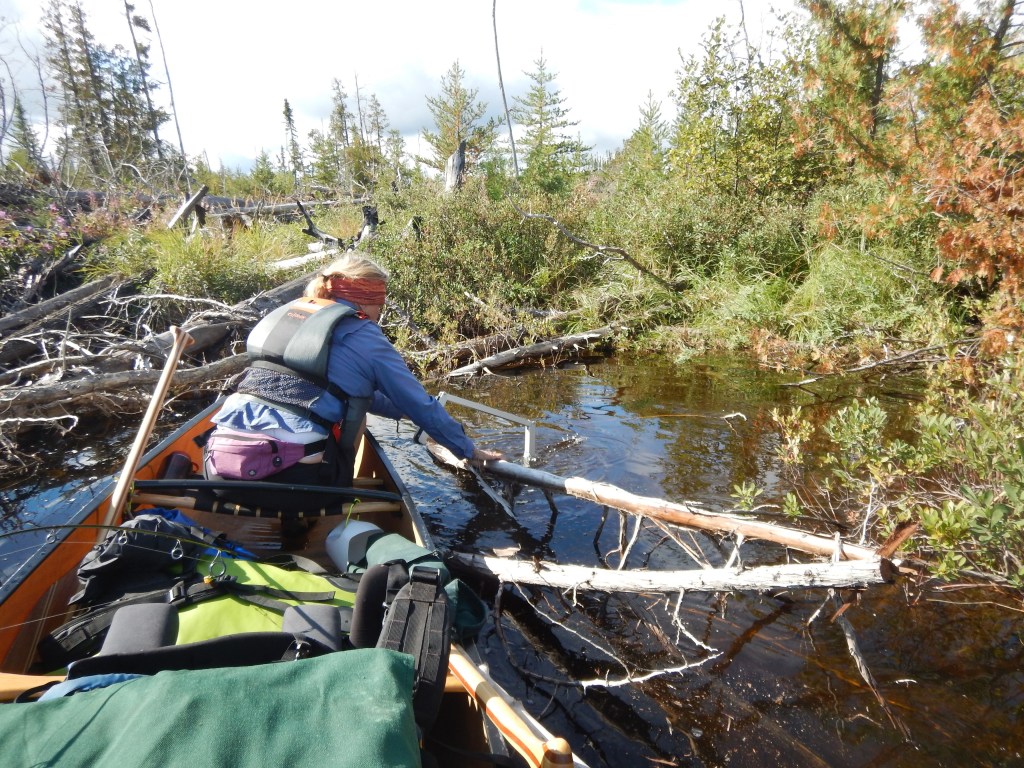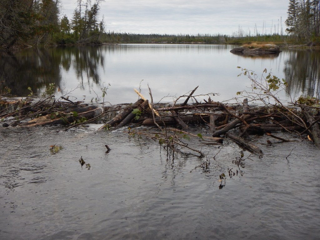 The portage was 210 meters and then a short paddle across a pond to a 60 meter portage.  A beaver had dammed to water and created the pond. These industrious critters raise the water level and generally make for easier canoe travel. However, there is the dam itself to contend with and we have names for the different types. A “speed bump” is a beaver dam that we can just paddle over. A “toll booth” dam requires us to get out, unload our gear, and lift the canoe over the beaver dam.  We paid a small toll for this one.