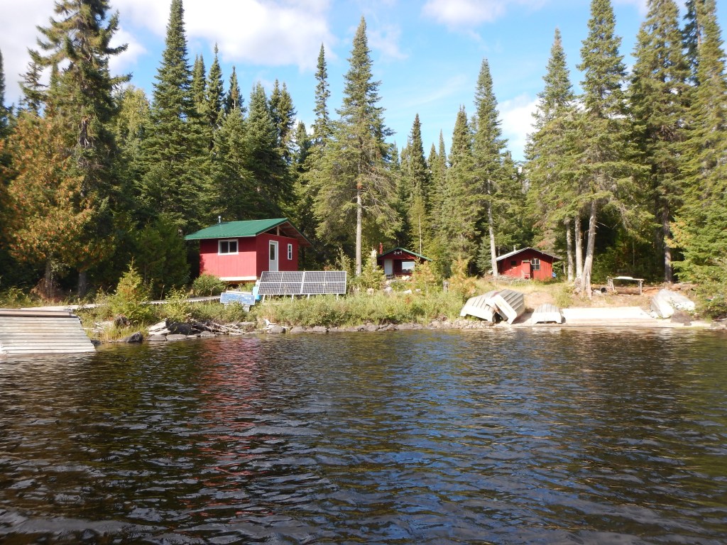 This last portage of 250 meters was well marked and with a very nice trail.  We ate a snack at the end and set up our fishing gear.  We were headed out onto Burntrock Lake, the final body of water on this trip. The weather was great, calm, and sunny with some clouds.  We fished for a while before entering the main body of the lake, but of course no bites. We started to think that there are no fish in Wabakimi or more likely, we just don’t know how to fish.  We trolled our lines as we paddled the open water toward toward the outpost camp that Bruce from Wabakimi Outfitters told us we could use for the night.  Fish or no fish, it was a beautiful day and great to be paddling in the middle of nowhere.  At this point we had seen no one for five days.