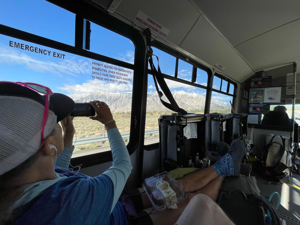 So today was a travel day. First we took the Eastern Sierra Transit Authority bus to Reno. This bus is like the typical rickety short buses used as airport parking shuttles … not very comfortable. Our first leg was from Lone Pine to Bishop. The driver of this bus decided to play military marching music VERY loud … and very annoying. We could barely converse.