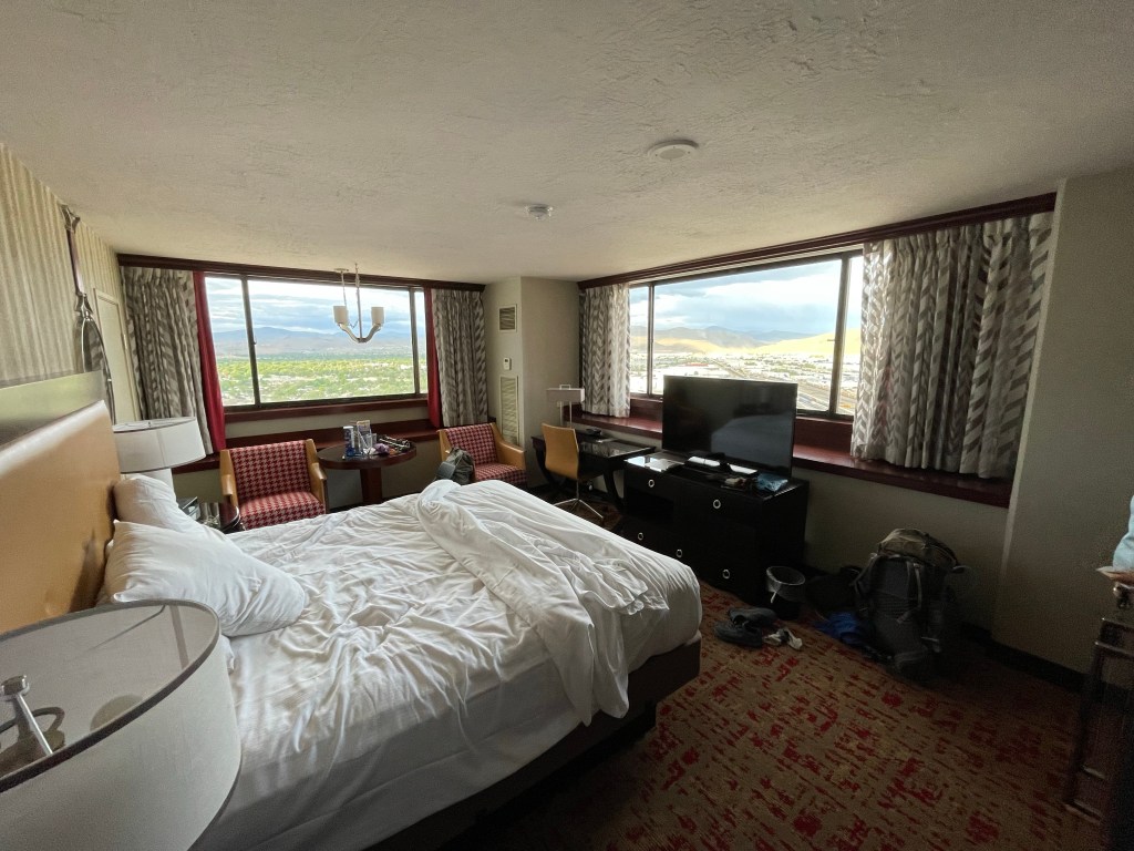 We checked into the Nugget Casino and Resort. We got a corner room with view of the foothills, which was pretty cool. Neither one of us are gamblers so we just ate at the restaurants and hung out in our room working on the blog and videos.