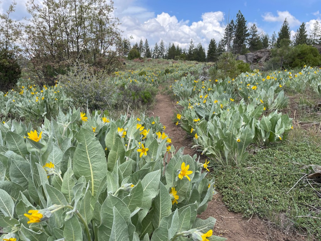 The trail eventually went downhill towards the meadows and this is where the mosquitos appeared. They were relentless and frankly quick a shock. Until now we did not have to deal with many bugs in trail but is is now late spring and they are out! The skeeters seemed to love Ellen’s blue sun hoody so she put on her rain jacket. We both got out our head nets. They weren’t as annoying as we were walking. But as soon as you stopped they swarmed.