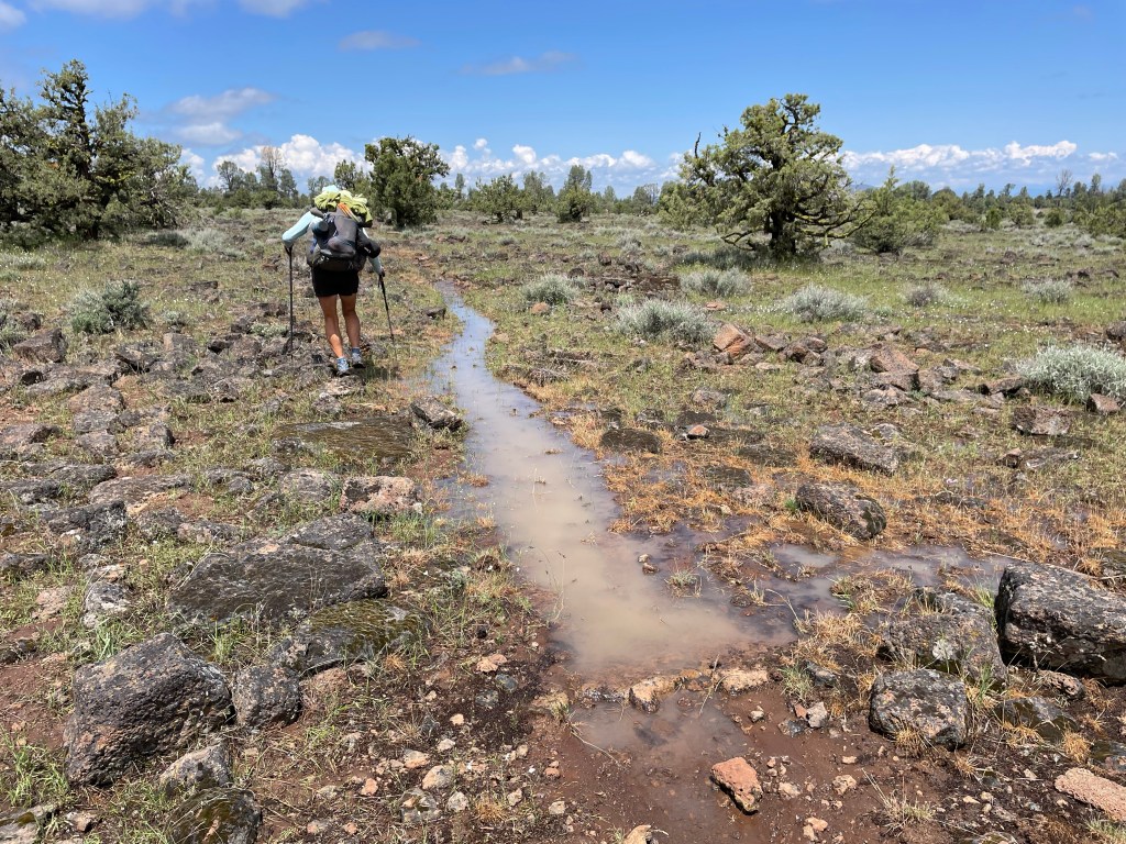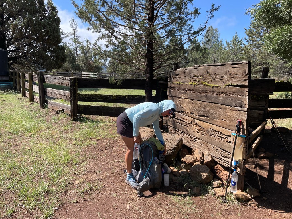 Cache 22 is a large water tank maintained by a trail angel. … possibly the rancher, not sure. We both had snacks and protein shakes and filtered water into our bottles. Two liters each should enough as it was only 9.6 miles to the next water source and the trail was mainly downhill.