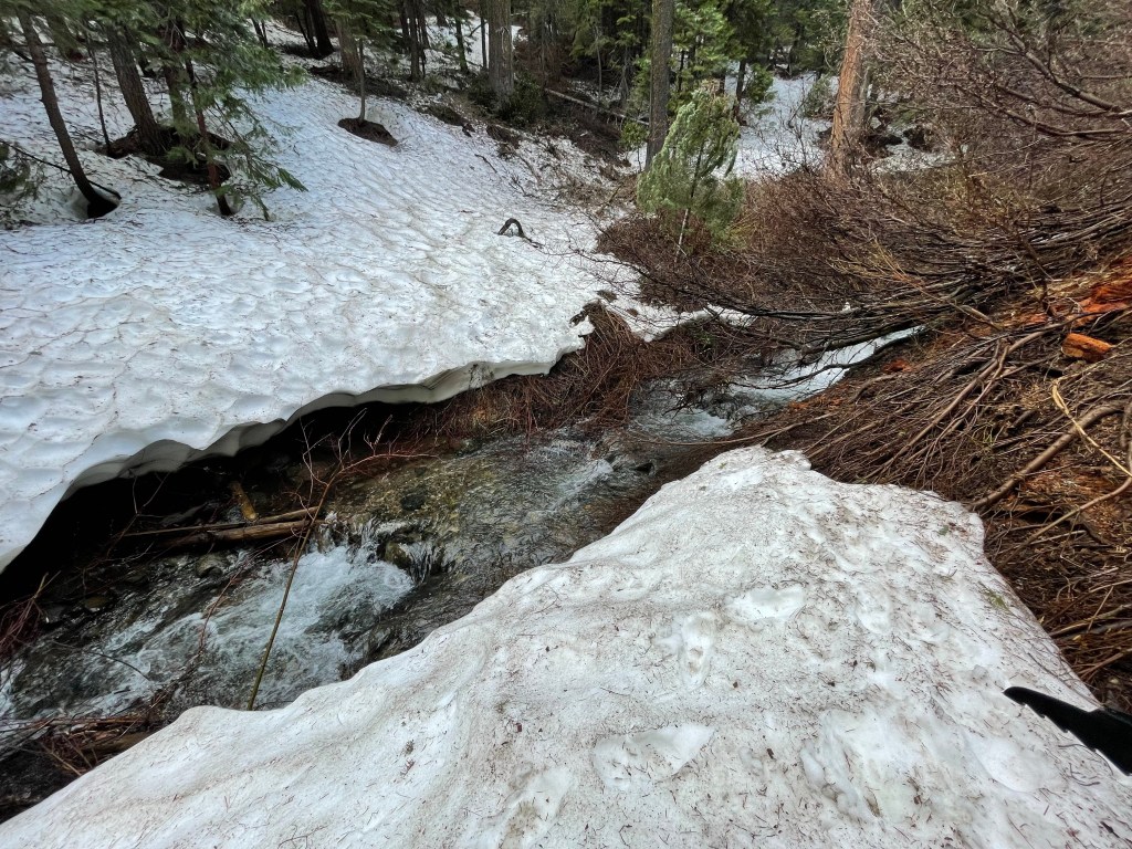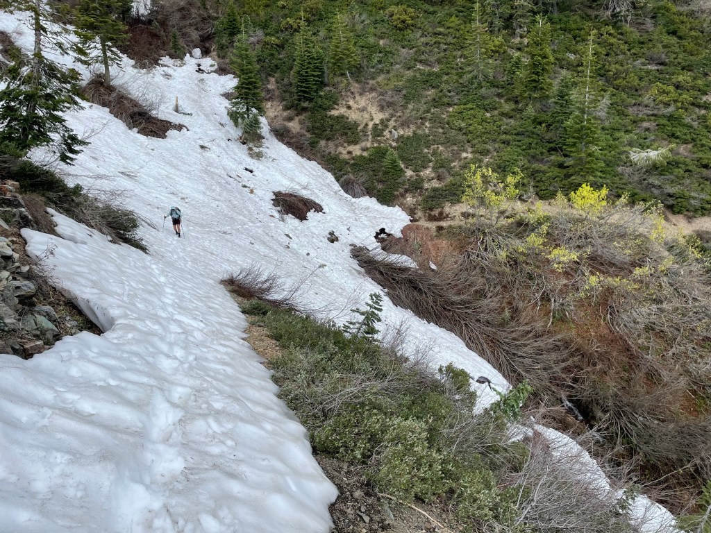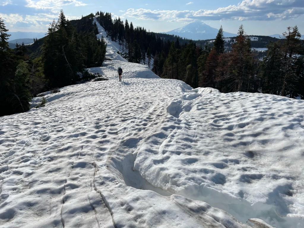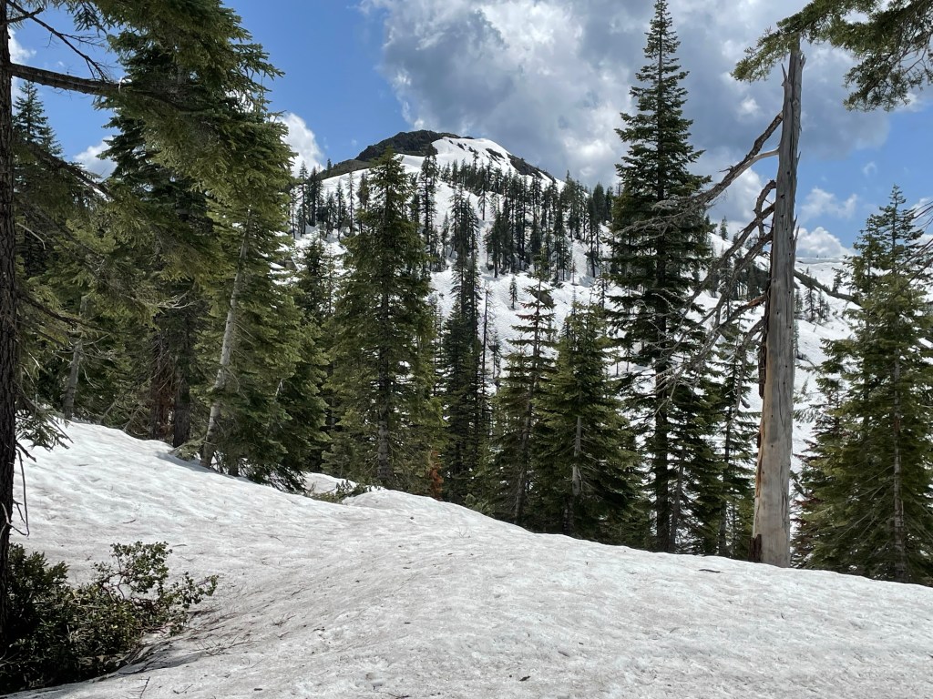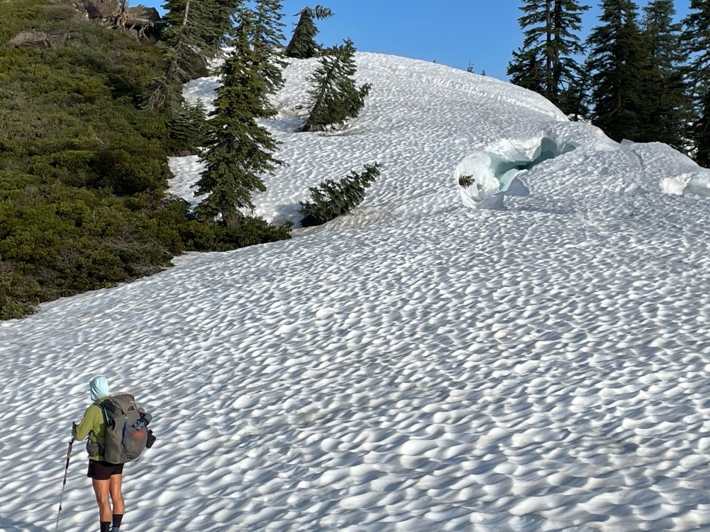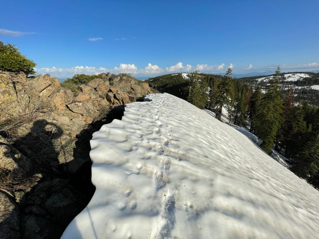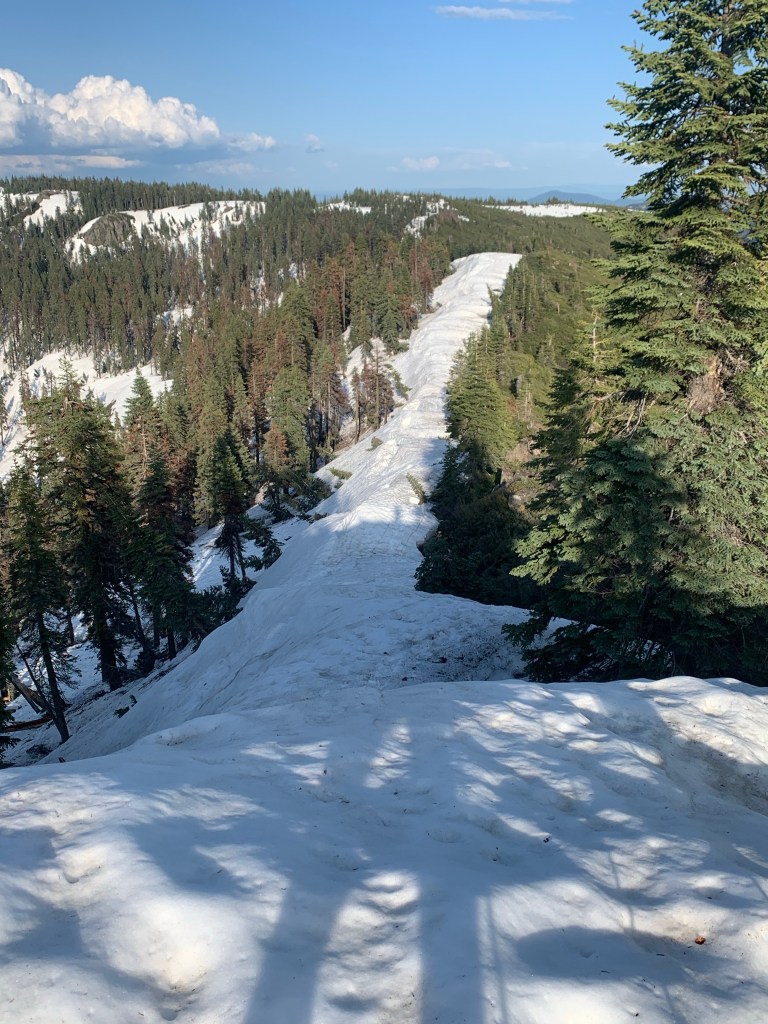 There was some snow free trail, but most of the time it was snow covered. To avoid some of the steepest sections of the snow-covered PCT, it was recommended to travel the path of a snow-covered road (Summit Lake Road) which parallels the PCT but higher up on the ridge. So we did. However, the “road” is really just a two-track OHV trail.