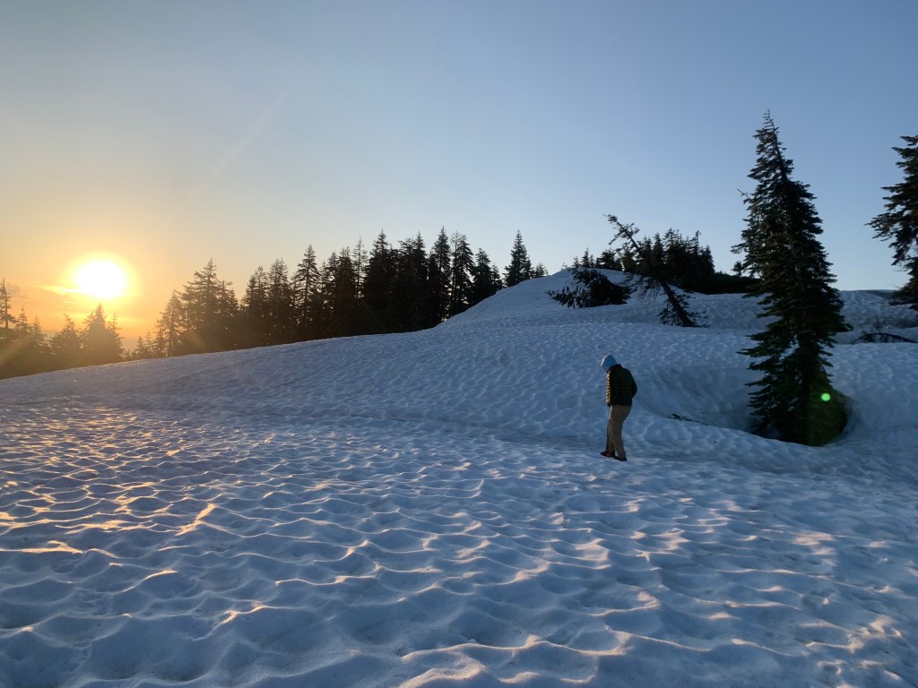 We got up to a beautiful sunrise. We had a quick breakfast, packed up and it was time to go. The snow had hardened a little it and we wanted to take advantage of that. It’s a lot easier to walk on hard snow with crampons. First order of business was to climb up and over the the snow drift that was next to camp.