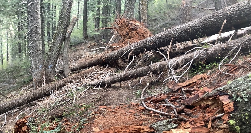 Further along, we noticed the trail was in much better condition. A trail crew had been through here and it was nice to walk on a trail without dodging sticks and tree trunks. A bit later we met the trial crew. There were six young adults from the SCA – student conservation association. They were led by “Mr. Kitchen” (his trail name) from the PCTA. We thanked them for their hard work and told them how much we appreciated their efforts.