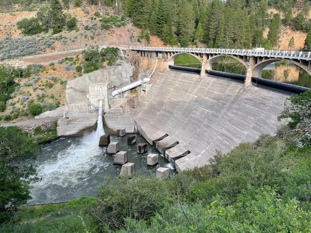 We took our time and just enjoyed the hiking this morning. The trail was soft and gently sloped. After about 2 miles we got to Pit River Dam #3 which backs up Lake Britton. The PCT crosses over the dam via a beautiful arched bridge. Water jetting out of a big tube from to the side of the dam.