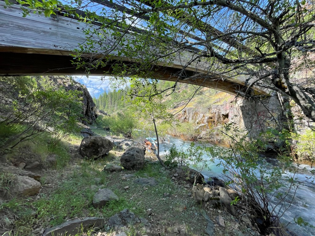For safety, we decided to first hand out packs over the tree. Ellen climbed down and around first and then Jeff handed over her backpack. However, once over, the pack slipped from her hands and started tumbling down the mountain! All we could do was hope and pray that it would stop before it got to the river.