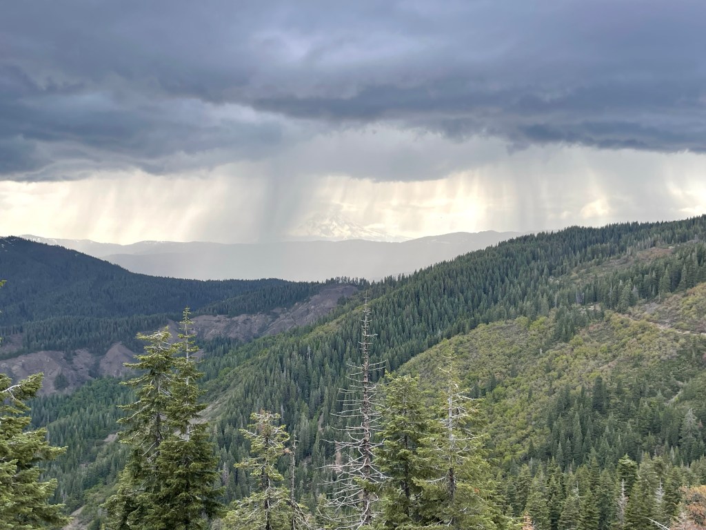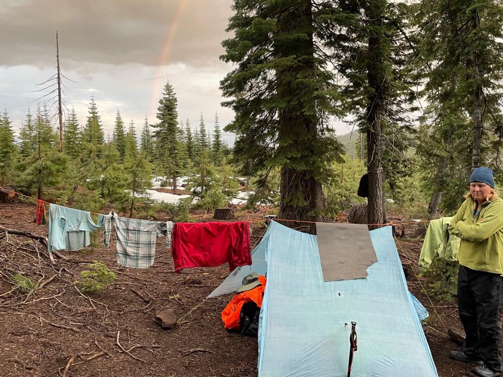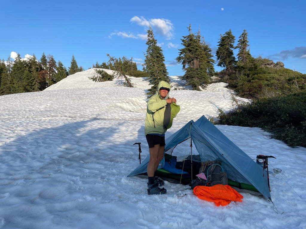 The snow coverage increased the further and higher we went but it was manageable. Up ahead the trail crosses an exposed ridge but there was rain and thunder in the area and so we opted to stop and hopefully wait out the storm. It started raining so we sheltered under a pine tree, boiled some water, and had dinner.