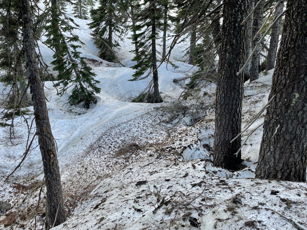 The trail was mostly under snow and the path was a traverse with lots of up and downs. This section of trail also had a lot of blowdowns we had to crawl over, under, or walk around.