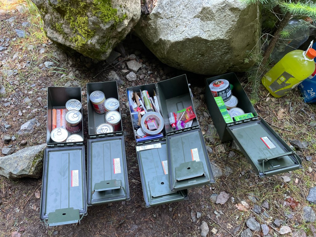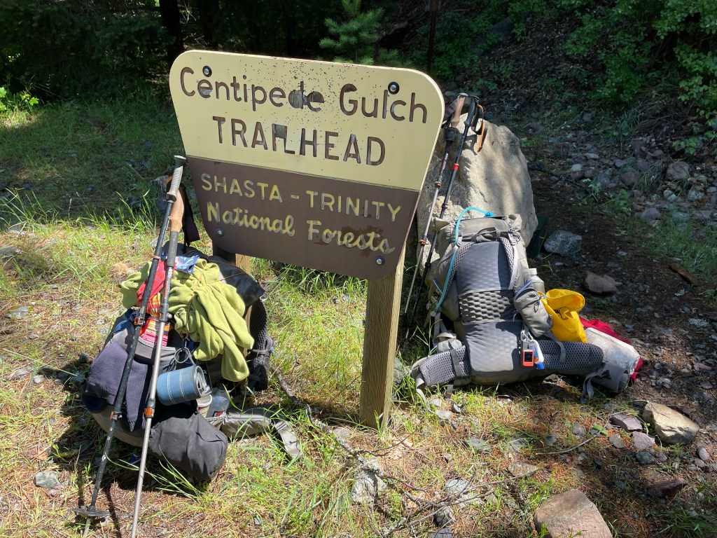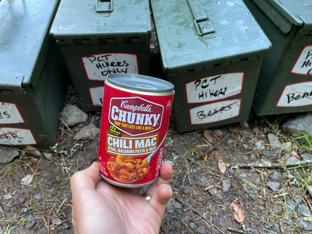 Having finally left Deer Creek, we were now following Butcherknife Creek. Then we got some serious trail magic. As we entered the parking lot for Centipede Gulch we noticed five metal army ammo boxes along with a gallon jug of Gatorade and some Pepsis. Inside the boxes were snacks, canned food, batteries, head nets, medicines, head lights, etc. This trail angel knows what hikers needed. We were sort of light on food so we each took a can of Chili Mac with pasta for dinner. We usually don’t do canned food on trail, but we couldn’t resist this and we only had to carry the for a short time.