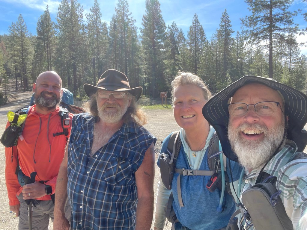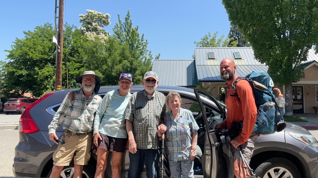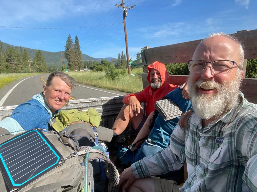 When we got to the Hwy, All In was waiting for us and generously gave up a ride into Etna to another pair of hikers, Orange and No Sweat. We waited for a few minutes when a car drove by and the couple in the car waived at us, but did not stop. A few minutes later that same car came back and they asked if we were PCT hikers. Ellen went up and talked with them and they offered the three of us a ride into Etna.
