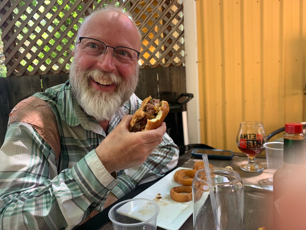 Once in Etna we got lunch at the brewery, went to the outfitter, got some groceries and tokens w/towels for the showers at the city park. Once at the park we found a spot to set up camp, took showers and relaxed.