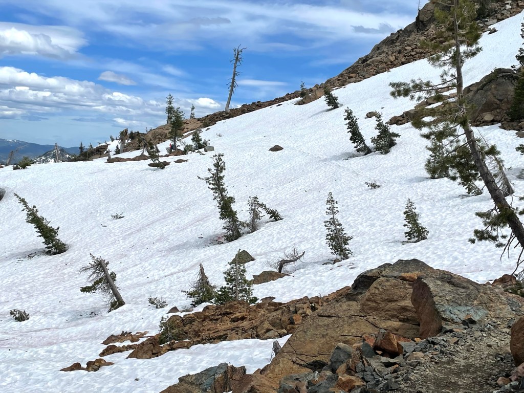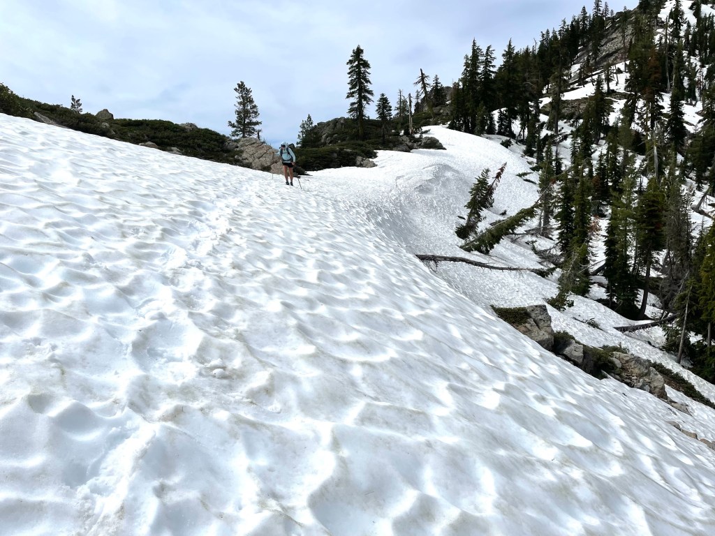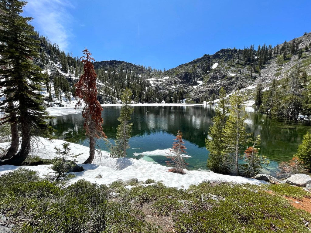 Next. we had about 4.5 miles until the next gem of alpine lakes, Upper and Lower Dead Fall Lakes. We again had to traverse an exposed section of snow covered trail to get to the lakes. We put on our crampons again and had no problems. Upper Dead Fall Lake was stunning! We lingered for a bit, filtered some water and continued on.